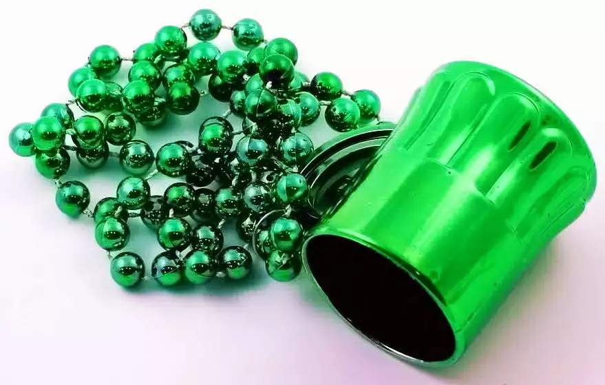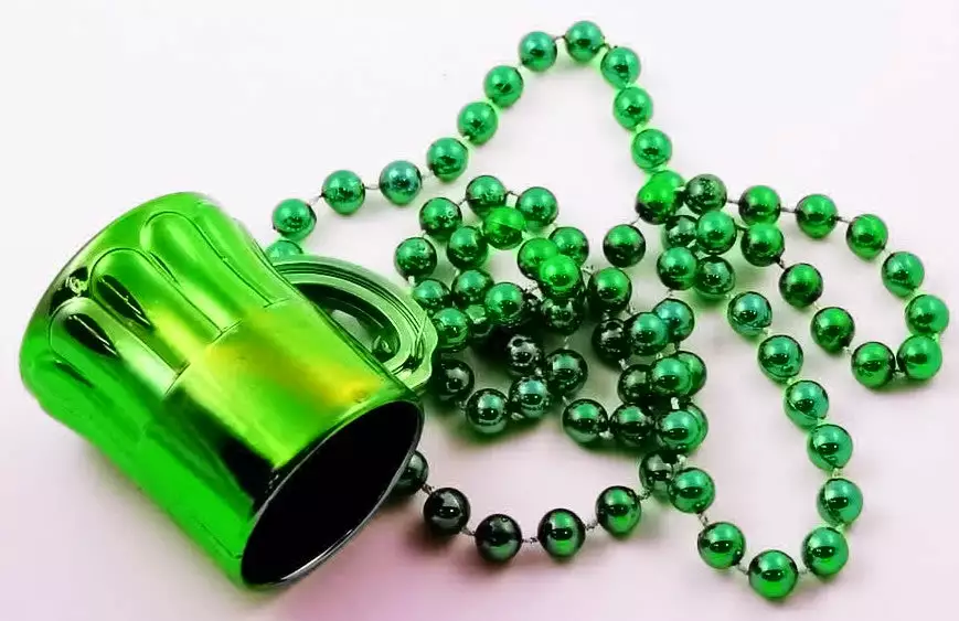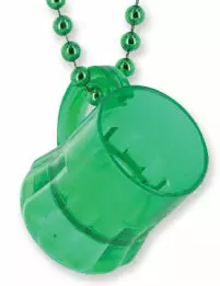 Irish Beer Mug Party Shot Glass Necklace. This great party necklace will have you covered with a shot glass all night long! A fully functional beer mug shaped shot glass holds a full once and a half shot of your favorite beverage! Perfect for bar hopping and drinking games at a party. This is the official necklace of the “power hour” at your next get together. Take a shot of beer every minute for an hour and have yourself a grand old time, and you have your shot glass with you where ever you go! This features 24” beaded metallic necklace with a real beer mug shaped shot glass!