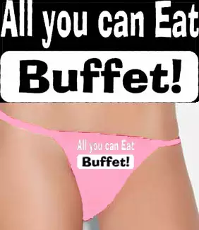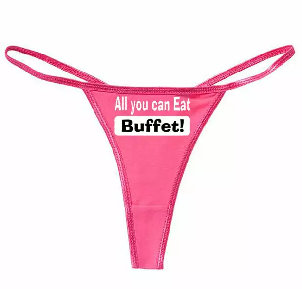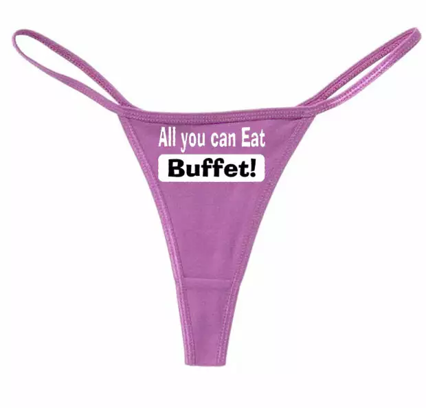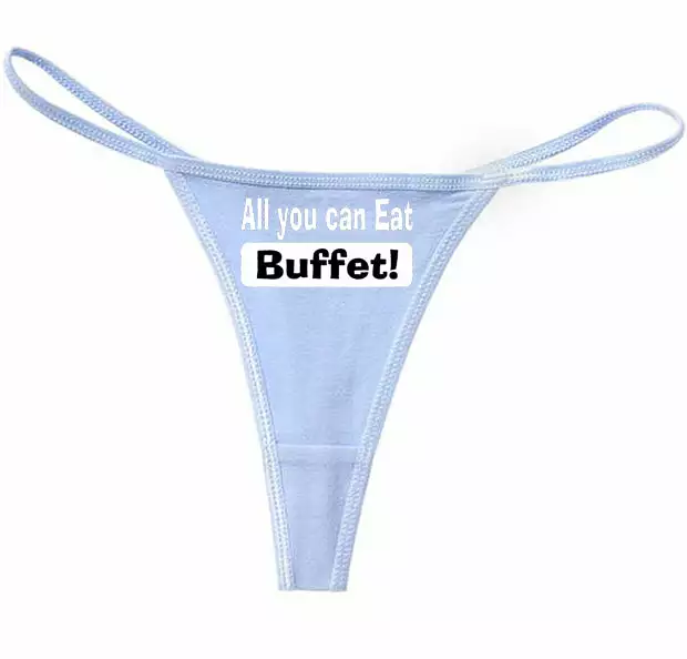 Ladies be prepared to see jaws drop with our new sexy thong underwear! Every pair of our sexy thong panties feature a funny saying like this “All You Can Eat Buffet” Thong. The perfect addition to any intimate outfit. Of course, they look incredible all by themselves as well.All of Bewild’s thongs are Made in the USA from soft 100% cotton and are machine washable.