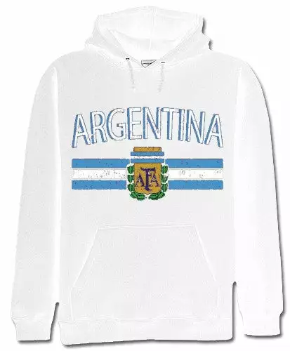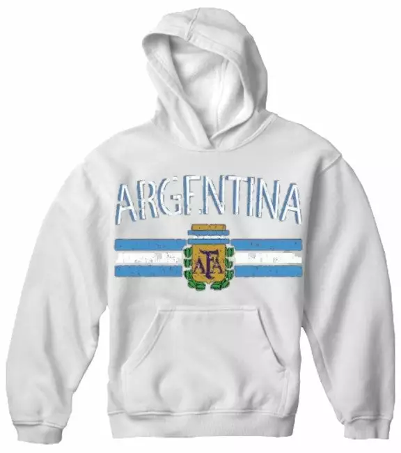 Argentina Vintage Flag International Hoodie. Show pride for your favorite Nation! Our collection of deluxe vintage international print Hoodies are the perfect way to support your home country. Each shirt features premium vintage style designs made to look distressed for that soft “Favorite Old Sweatshirt” look from day one. These shirts are perfect whether you are rooting for your favorite soccer nation or just showing your love for a special country. Bold athletic style writing spells out each country’s name curved above the country’s national shield; a classic design that is sure to display your patriotism! Each shirt is printed to order on a deluxe hooded sweatshirt in your choice of color.