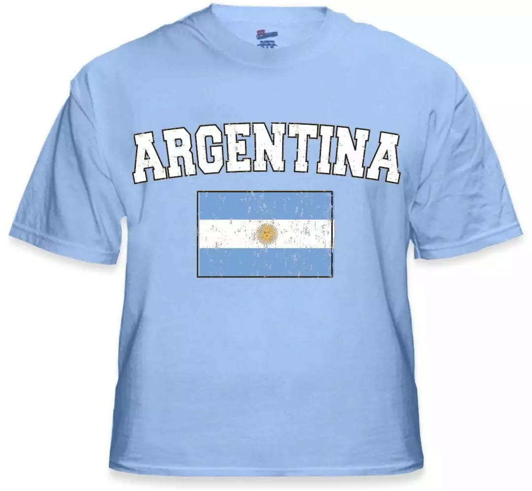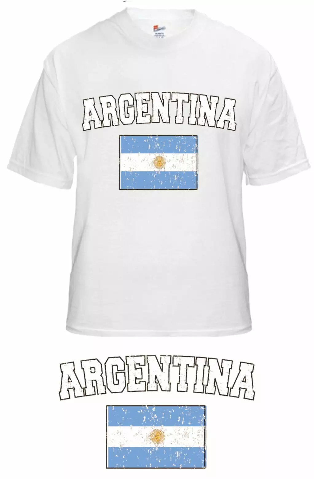 Argentina Vintage Flag International Mens T-Shirt. Show pride for your favorite Nation! Our collection of deluxe vintage international print t-shirts are the perfect way to support your home country. Each shirt features premium vintage style designs made to look distressed for that soft “Favorite Old T-shirt” look from day one. These shirts are perfect whether you are rooting for your favorite soccer nation or just showing your love for a special country. Bold athletic style writing spells out each country’s name curved above the country’s national shield; a classic design that is sure to display your patriotism! Each shirt is printed to order on a deluxe Cotton tee shirt in your choice of color.