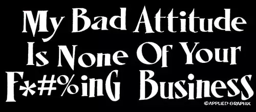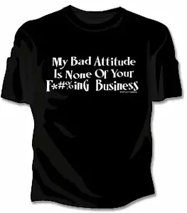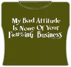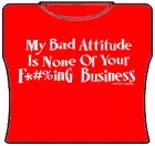 Bad Attitude Girls T-Shirt. Exclusively from Bewild.com, these new tee’s feature hard-core sayings that say it all. From “Lick Here For Full View” to “Skanky white-trailer trash”. How about a t-shirt that says “Dip me in Chocolate and throw me to the lesbians?” Our short sleeve “Bad Attitude” t-shirts are made from a 100% fully machine washable preshrunk cotton for a cool and comfortable fit every time.