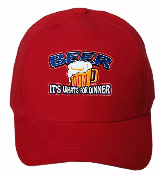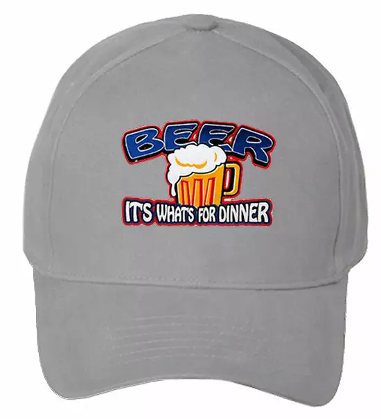 Beer It’s What’s For Dinner Baseball Hat now available. Get Beer It’s What’s For Dinner Baseball Hat featuring 100% cotton 5 panel construction, a pre-curved bill, triple stitched sweatband and adjustable Velcro closure.