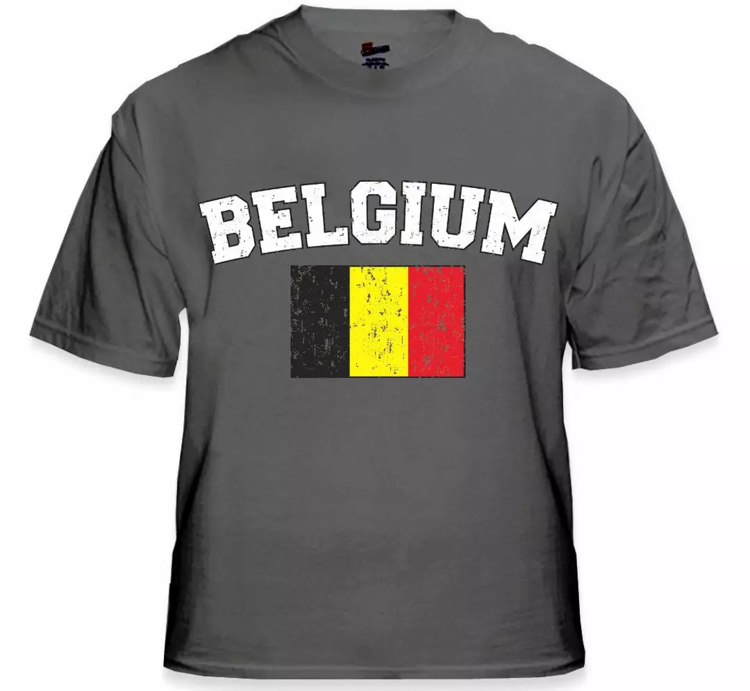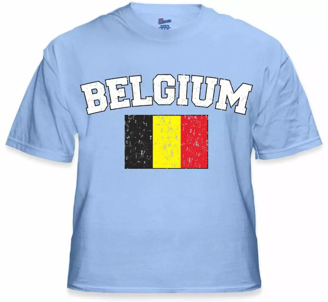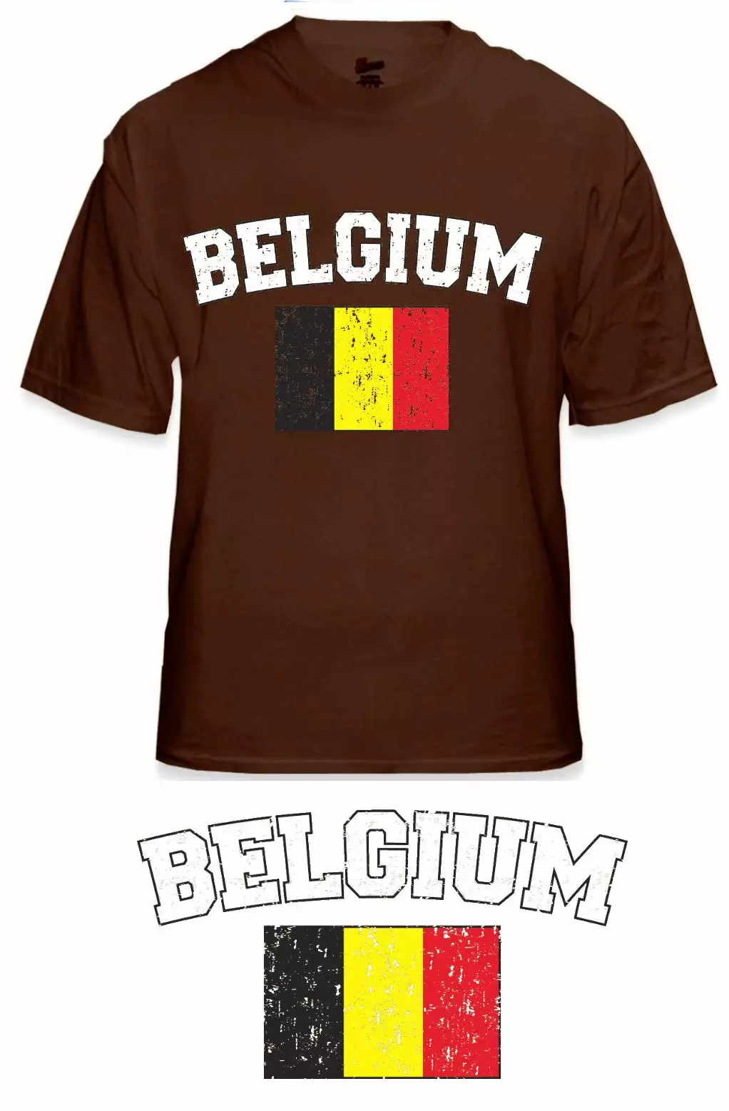 Belgium Vintage Flag International Mens T-Shirt. Show pride for your favorite Nation! Our collection of deluxe vintage international print t-shirts are the perfect way to support your home country. Each shirt features premium vintage style designs made to look distressed for that soft “Favorite Old T-shirt” look from day one. These shirts are perfect whether you are rooting for your favorite soccer nation or just showing your love for a special country. Bold athletic style writing spells out each country’s name curved above the country’s national shield; a classic design that is sure to display your patriotism! Each shirt is printed to order on a deluxe Cotton tee shirt in your choice of color.