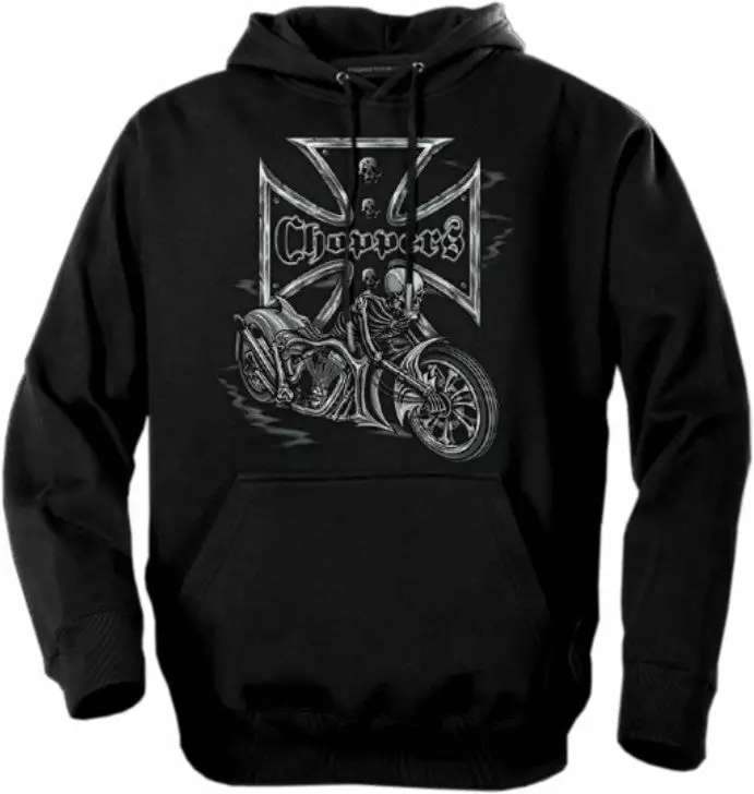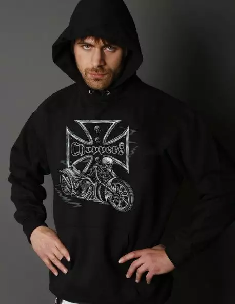Biker Hoodies – “Chopper Skeleton Bike” Biker Hoodie. Look No Further, you have found on of the most Bad Ass Biker sweat shirts on the web. As a biker, you take pride in all you stand for, and now this exclusive line of Biker hoodies lets you wear whats on your mind. Forget prim and proper, these sweat shirts are blacked out and feature big, bold biker sayings on them. These hoodies look great beneath a leather vest, with a pair of your favorite jeans and those ol faithful boots that haven’t let you down in years. Every biker hoodie is available on any color hoodie you want…. as long as the color you want is black.