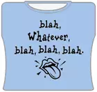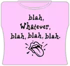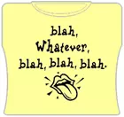 Blah Blah Blah Girls T-Shirt. Exclusively from Bewild.com, these new tee’s feature hard-core sayings that say it all. From “Trust Me I’m A Doctor” to “Thats Mr. Asshole To You”. How about a t-shirt that says “I Scored High On My Drug Test” Our short sleeve t-shirts are made from a 100% fully machine washable cotton/poly blend for a cool and comfortable fit every time. On the front of this shirt it says “Blah Whatever, Blah Blah Blah”