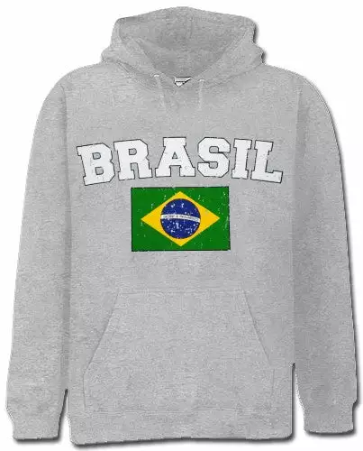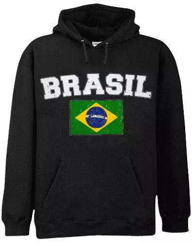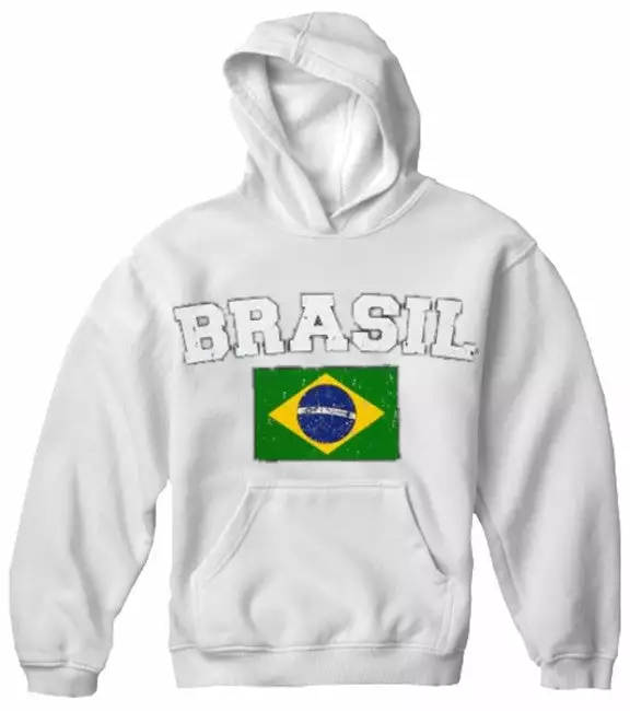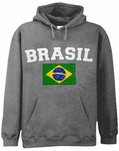 Brasil Vintage Flag International Hoodie. Show pride for your favorite Nation! Our collection of deluxe vintage international print Hoodies are the perfect way to support your home country. Each shirt features premium vintage style designs made to look distressed for that soft “Favorite Old Sweatshirt” look from day one. These shirts are perfect whether you are rooting for your favorite soccer nation or just showing your love for a special country. Bold athletic style writing spells out each country’s name curved above the country’s national shield; a classic design that is sure to display your patriotism! Each shirt is printed to order on a deluxe hooded sweatshirt in your choice of color.