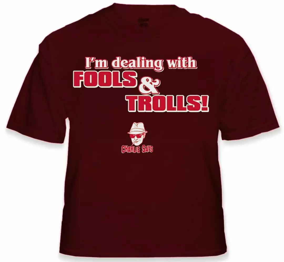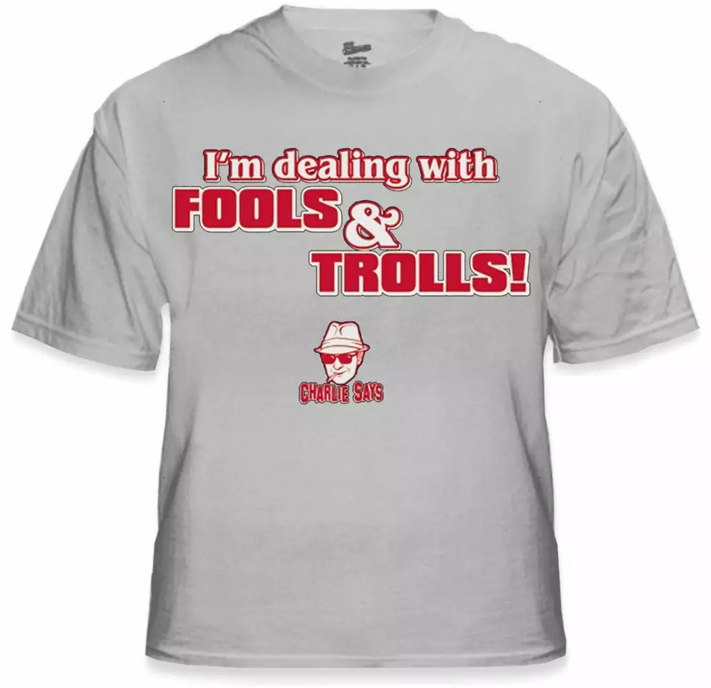 Charlie Says – I’m Dealing With Fools & Trolls T-Shirt. Since Charlie Sheen’s interview he has become more popular then ever, forget two and a half men. Charlie Sheen quote t-shirts have been in demand. Charlie Sheen has seemingly lost his mind and in celebration of the actor’s insanity we are proud to offer you this line of Cracked out shirts that feature some of Charlie’s most infamous sayings. These shirts will make you an instant party animal… if you can handle it. If you have Tiger Blood running threw your veins click the order button and expieriance Charlie Sheen Today! These shirts may feature popular Charlie Sheen quotes but are in no way affiliated with Charlie Sheen.