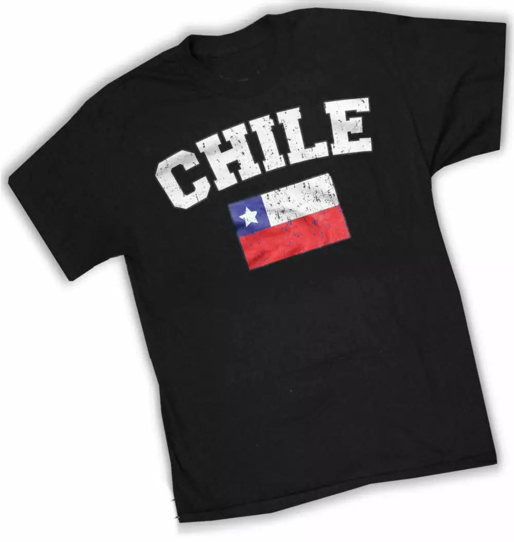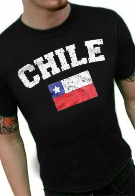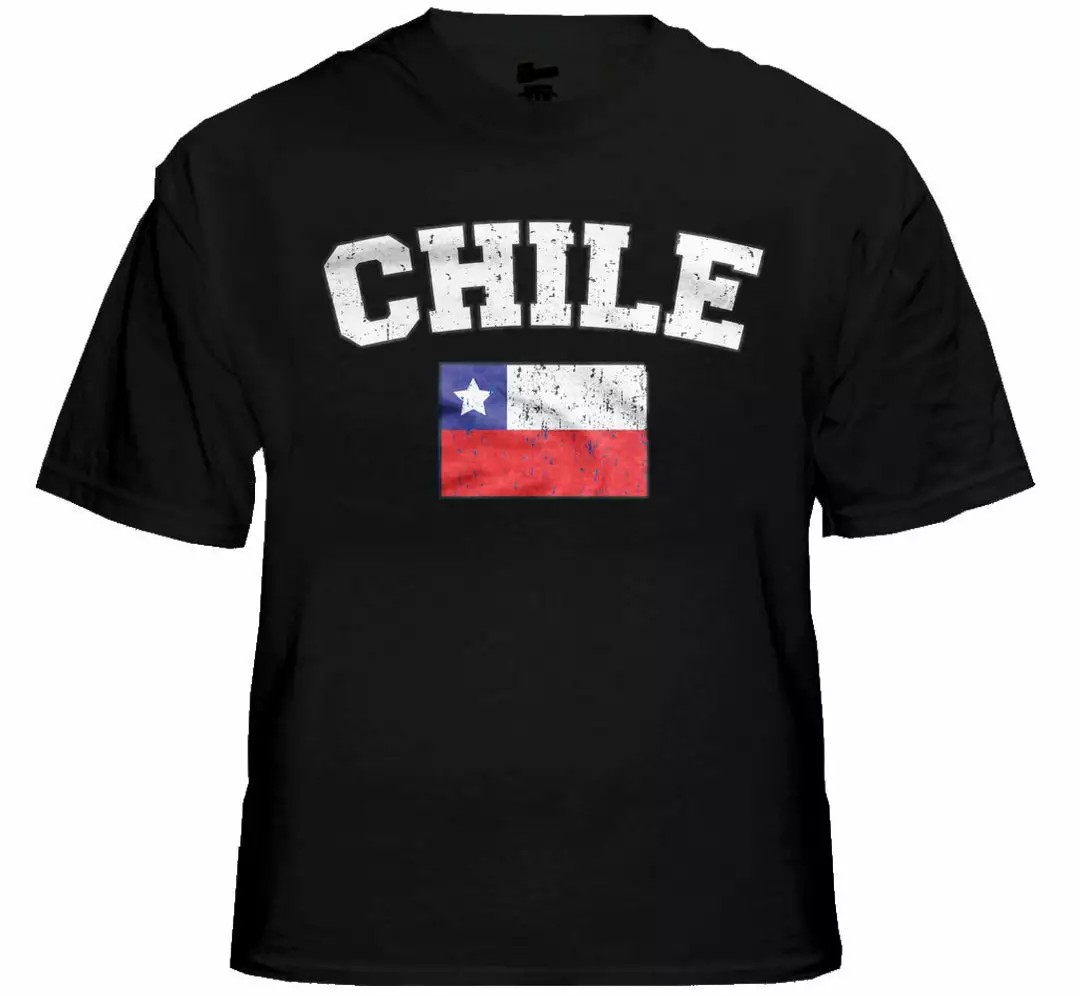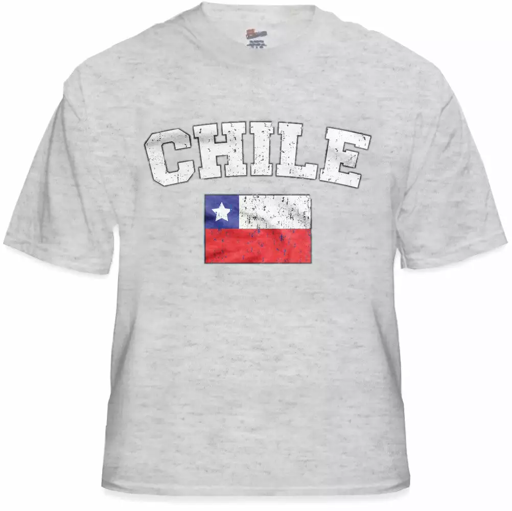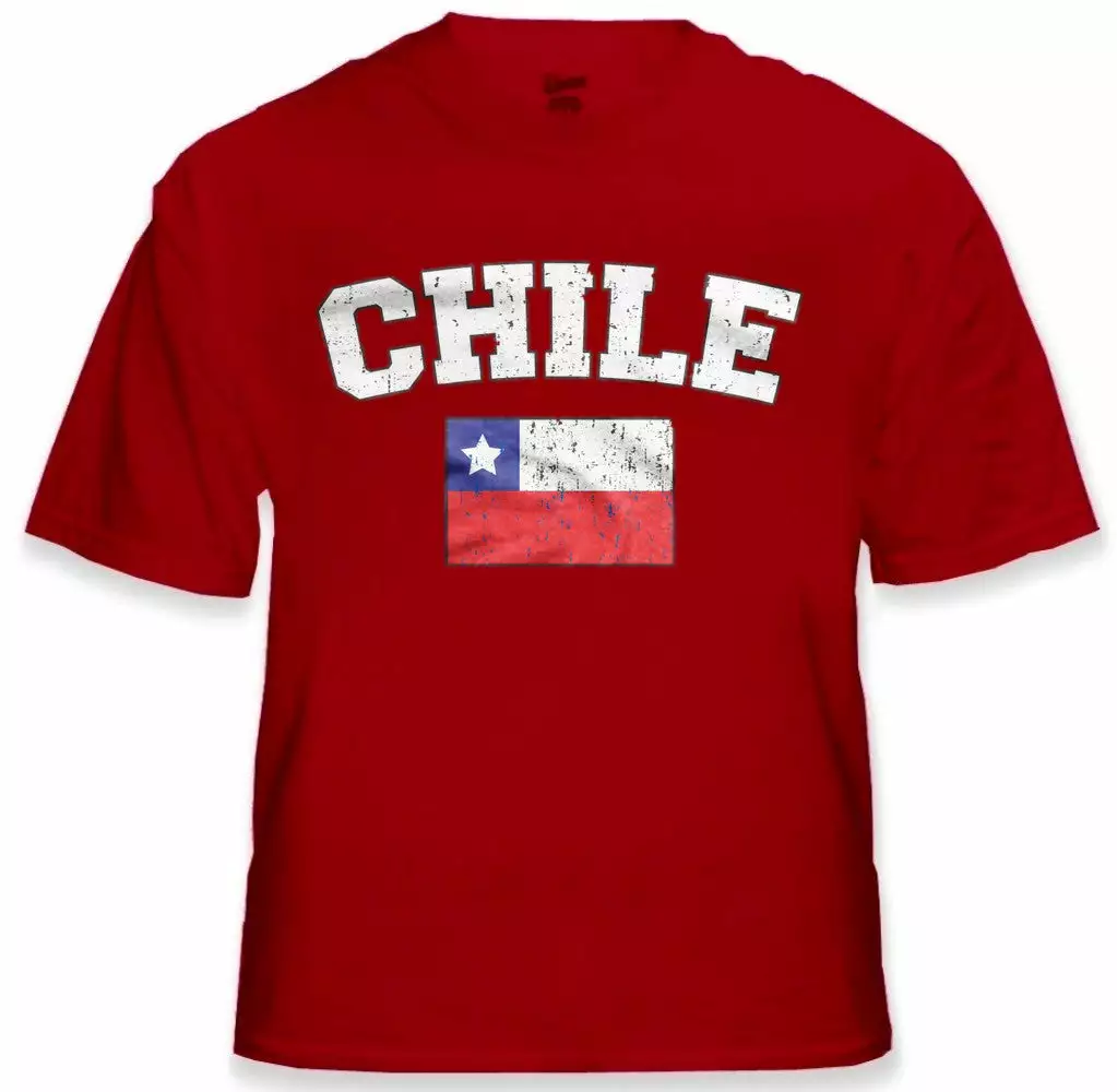 Chile Vintage Flag International Mens T-Shirt. Show pride for your favorite Nation! Our collection of deluxe vintage international print t-shirts are the perfect way to support your home country. Each shirt features premium vintage style designs made to look distressed for that soft “Favorite Old T-shirt” look from day one. These shirts are perfect whether you are rooting for your favorite soccer nation or just showing your love for a special country. Bold athletic style writing spells out each country’s name curved above the country’s national shield; a classic design that is sure to display your patriotism! Each shirt is printed to order on a deluxe Cotton tee shirt in your choice of color.
