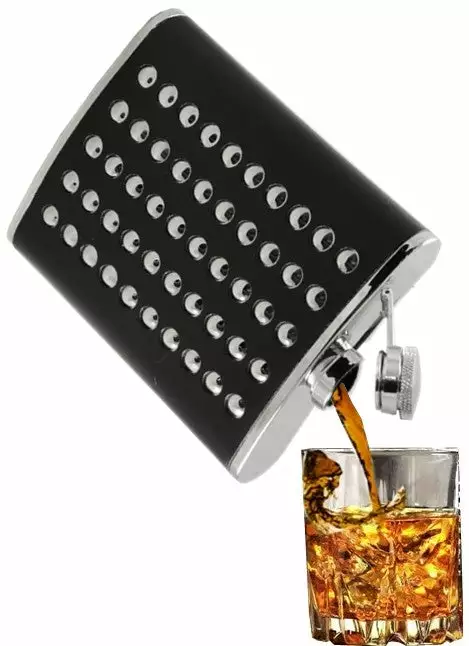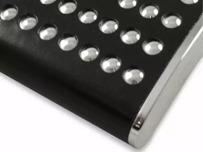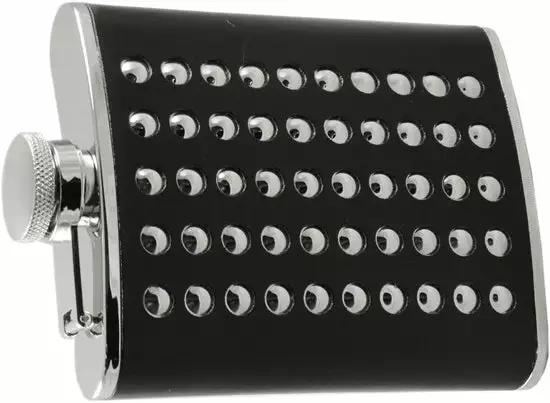 Chrome Studded Leather Wrap Hip Flask. This stainless steel pocket flask is professionally wrapped in black faux leather and features dozens of polished chrome dome head studs for a real tough look. This flask will hole up to 6 fl oz. of your favorite adult beverage, that’s 4 big shots ready to mix or drink straight! The comfortable contour makes this flask comfortable while in your pocket and fits flush to your thigh for low profile appearance even when you are seated. A Leak proof screw on cap keeps your contents from spilling and it is attached to the flask so it’s not going any where! Why pay high liquor prices at your favorite restaurants and events? A cocktail at a club or ball game can go for more then $10! Make the same cocktail yourself for a fraction of the price, the flask will pay for itself by the first use!
