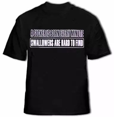 A Sucker Is Born Every Minute Swallowers Are Hard To Find T-Shirt. Exclusively from Bewild.com, these new t-shirt’s feature hard-core sayings that say it all. From “Lick Here For Full View” to “Skanky white-trailer trash”. How about a tee that says “A Suker Is Born Every Minute Swallowers Are Hard To Find?” Our short sleeve “A Suker Is Born Every Minute Swallowers Are Hard To Find” t-shirts are made from a 100% fully machine washable cotton/poly blend for a comfortable fit every time.
