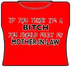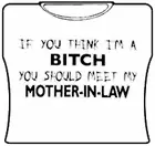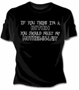 Bitch Mother In Law Girls T-Shirt. Exclusively from Bewild.com, these new tee’s feature hard-core sayings that say it all. From “Lick Here For Full View” to “Skanky white-trailer trash”. How about a t-shirt that says “Dip me in Chocolate and throw me to the lesbians?” Our short sleeve “Bitch Mother In Law” t-shirts are made from a 100% fully machine washable preshrunk cotton for a cool and comfortable fit every time.