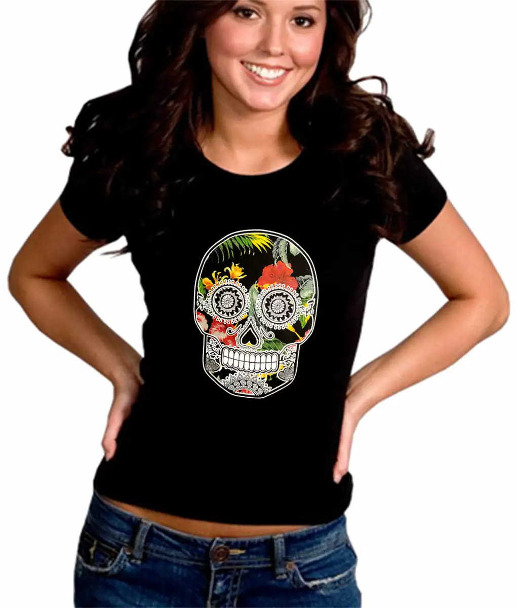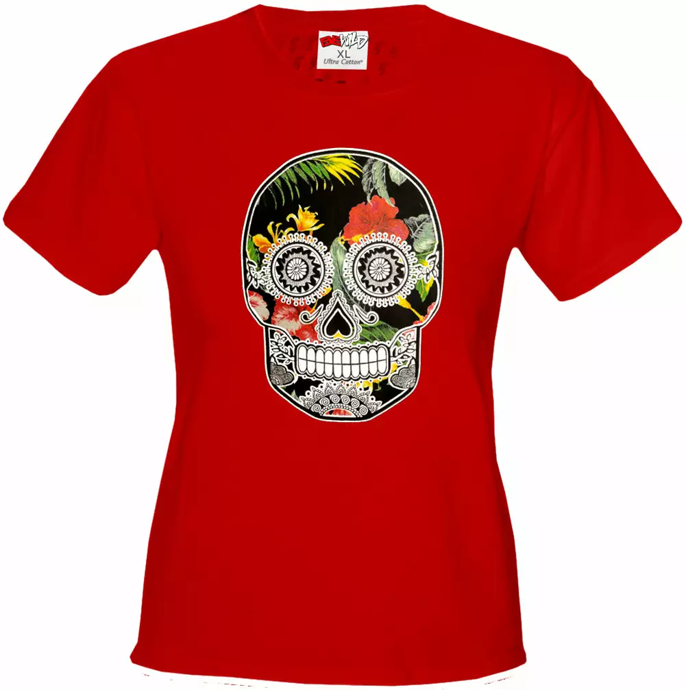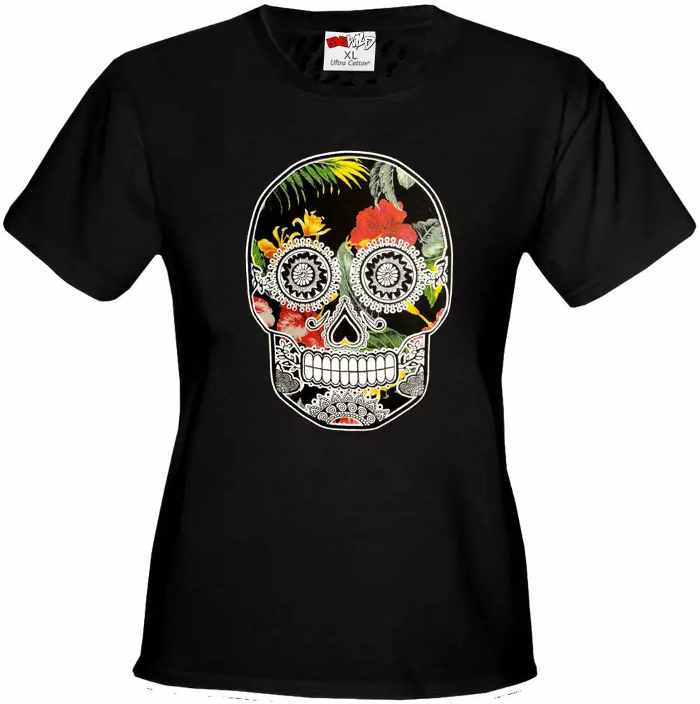 Floral Sugar Skull Girls T-shirts have a classic, comfortable fit. Shirts are pre-shrunk, so you can expect little to no shrinkage. Available in a Womens Box-cut style, or a Juniors fitted shirt that is contoured at the waist.