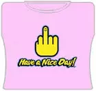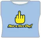 Have A Nice Day Girls T-Shirt. Exclusively from Bewild.com, these new tee’s feature hard-core sayings that say it all. From “Trust Me I’m A Doctor” to “Thats Mr. Asshole To You”. How about a t-shirt that says “I Scored High On My Drug Test” Our short sleeve t-shirts are made from a 100% fully machine washable cotton/poly blend for a cool and comfortable fit every time. On the front of this shirt it says “Have A Nice Day” with a hand giving the finger.