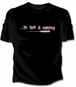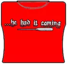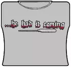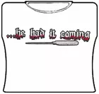 He Had It Coming Girls T-Shirt. Exclusively from Bewild.com, these new tee’s feature hard-core sayings that say it all. From “Lick Here For Full View” to “Skanky white-trailer trash”. How about a t-shirt that says “Dip me in Chocolate and throw me to the lesbians?” Our short sleeve “He Had It Coming” t-shirts are made from a 100% fully machine washable preshrunk cotton for a cool and comfortable fit every time.