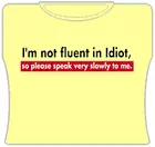 I’m Not Fluent In Idiot Girls T-Shirt. Exclusively from Bewild.com, these new tee’s feature hard-core sayings that say it all. From “Trust Me I’m A Doctor” to “Thats Mr. Asshole To You”. How about a t-shirt that says “I Scored High On My Drug Test” Our short sleeve t-shirts are made from a 100% fully machine washable cotton/poly blend for a cool and comfortable fit every time. On the front of this shirt it says “I’m Not Fluent In Idiot, So Please Speak Very Slowly To Me”.