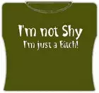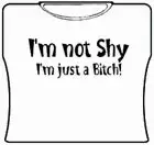 Im Not Shy Girls T-Shirt. Exclusively from Bewild.com, these new tee’s feature hard-core sayings that say it all. From “Trust Me I’m A Doctor” to “Thats Mr. Asshole To You”. How about a t-shirt that says “I Scored High On My Drug Test” Our short sleeve t-shirts are made from a 100% fully machine washable cotton/poly blend for a cool and comfortable fit every time. On the front of this shirt it says “Im not shy, Im Just a Bitch!”