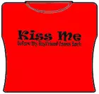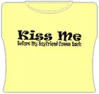 Kiss Me Girls T-Shirt. Exclusively from Bewild.com, these new tee’s feature hard-core sayings that say it all. From “Trust Me I’m A Doctor” to “Thats Mr. Asshole To You”. How about a t-shirt that says “I Scored High On My Drug Test” Our short sleeve t-shirts are made from a 100% fully machine washable cotton/poly blend for a cool and comfortable fit every time. On the front of this shirt it says “Kiss Me Before My Boy Friends Comes Back”.