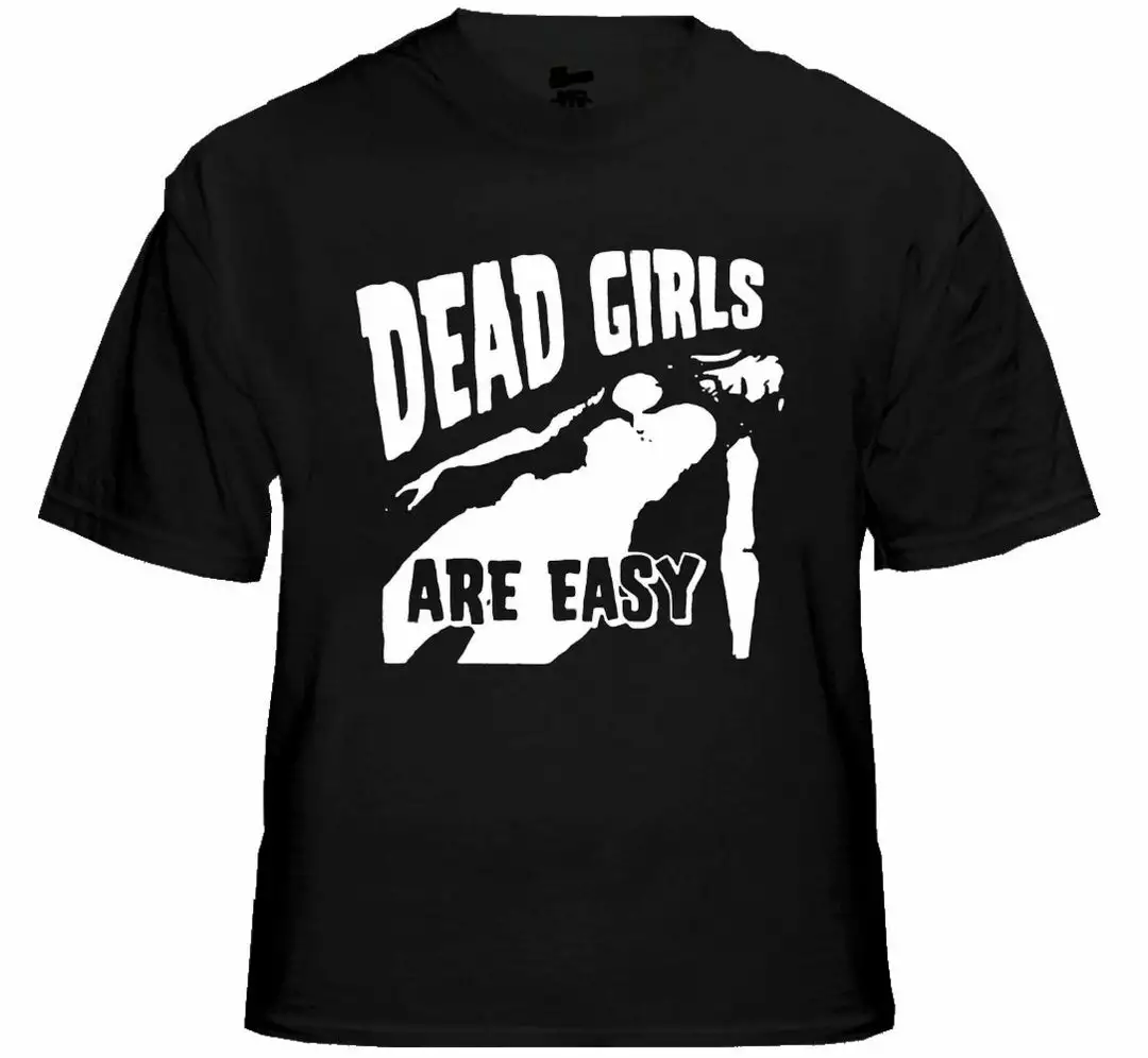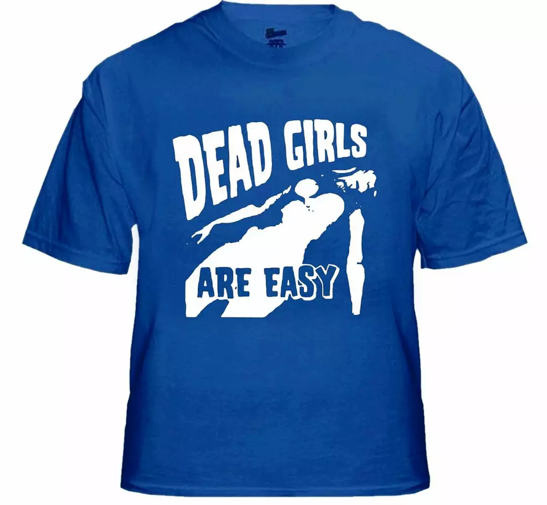 Dead Girls Are Easy T-Shirt. This design is sure to bring out the necrophiliac in all of us. Who has time for dating, wining and dining and boring conversation just to get laid? That’s why dead girls are easy. In a way a dead girl seems to be the perfect mate.. They don’t back talk, complain, get jealous and you can always find them right where you left them and of course they never say no! Only draw back is decomposition so you better get it while the gettin’s good! Yes, we know this shirt is offensive.. And NO we do not endorse the practice of sex with corpses but hey! It’s only a T-Shirt!