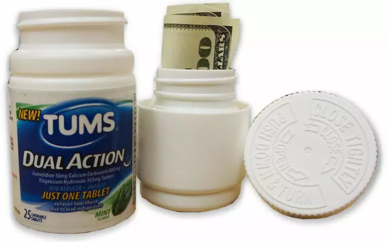 TUMS Dual Action Diversion Safe. Keep you valuables hidden in plain sight. Where dose a wise man hide a pebble? On a beach. This diversion safe is the same concept. Nobody would ever suspect your Bottle of TUMS in your medicine chest actually conceals and protects your most valuable possessions. This can safe is unique in the fact that you can fill the top portion with actual pills making this safe look and function just like the real thing. But this pill bottle has a secret.. It’s secret is the hidden compartment in the bottom which can be unscrewed to effectively hide money, jewelry and even Rx Drugs. This Diversion safe is made of authentic brand name product containers so the are indistinguishable from the actual product it is immolating. A thief would never think to steal your bottle of TUMS, and in turn they will never steal your valuables.