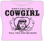 Don’t Call Me A Cowgirl Girls T-Shirt. Exclusively from Bewild.com, these new tee’s feature hard-core sayings that say it all. From “Trust Me I’m A Doctor” to “Thats Mr. Asshole To You”. How about a t-shirt that says “I Scored High On My Drug Test” Our short sleeve t-shirts are made from a 100% fully machine washable cotton/poly blend for a cool and comfortable fit every time. On the front of this shirt it says “Don’t Call Me A Cowgirl Till You See Me Ride”