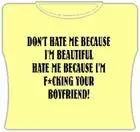 Don’t Hate Me Girls T-Shirt. Exclusively from Bewild.com, these new tee’s feature hard-core sayings that say it all. From “Trust Me I’m A Doctor” to “Thats Mr. Asshole To You”. How about a t-shirt that says “I Scored High On My Drug Test” Our short sleeve t-shirts are made from a 100% fully machine washable cotton/poly blend for a cool and comfortable fit every time. On the front of this shirt it says “Don’t Hate Me Cause I’m Beautiful Hate Me Cause I’m Fuckin Your Boyfriend”.