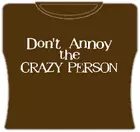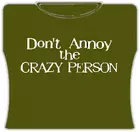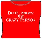 Dont Annoy The Crazy Person Girls T-Shirt. Exclusively from Bewild.com, these new tee’s feature hard-core sayings that say it all. From “Trust Me I’m A Doctor” to “Thats Mr. Asshole To You”. How about a t-shirt that says “I Scored High On My Drug Test” Our short sleeve t-shirts are made from a 100% fully machine washable cotton blend for a cool and comfortable fit every time. On the front of this shirt it says “Dont Annoy The Crazy Person”.
