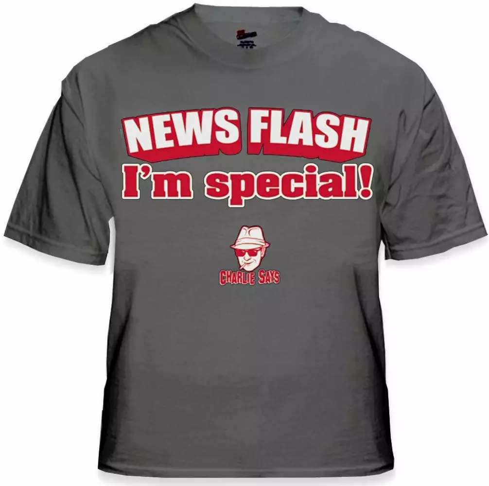 Charlie Says – News Flash I’m Special! T-Shirt. Since Charlie Sheen’s interview he has become more popular then ever, forget two and a half men. Charlie Sheen quote t-shirts have been in demand. Charlie Sheen has seemingly lost his mind and in celebration of the actor’s insanity we are proud to offer you this line of Cracked out shirts that feature some of Charlie’s most infamous sayings. These shirts will make you an instant party animal… if you can handle it. If you have Tiger Blood running threw your veins click the order button and expieriance Charlie Sheen Today! These shirts may feature popular Charlie Sheen quotes but are in no way affiliated with Charlie Sheen.