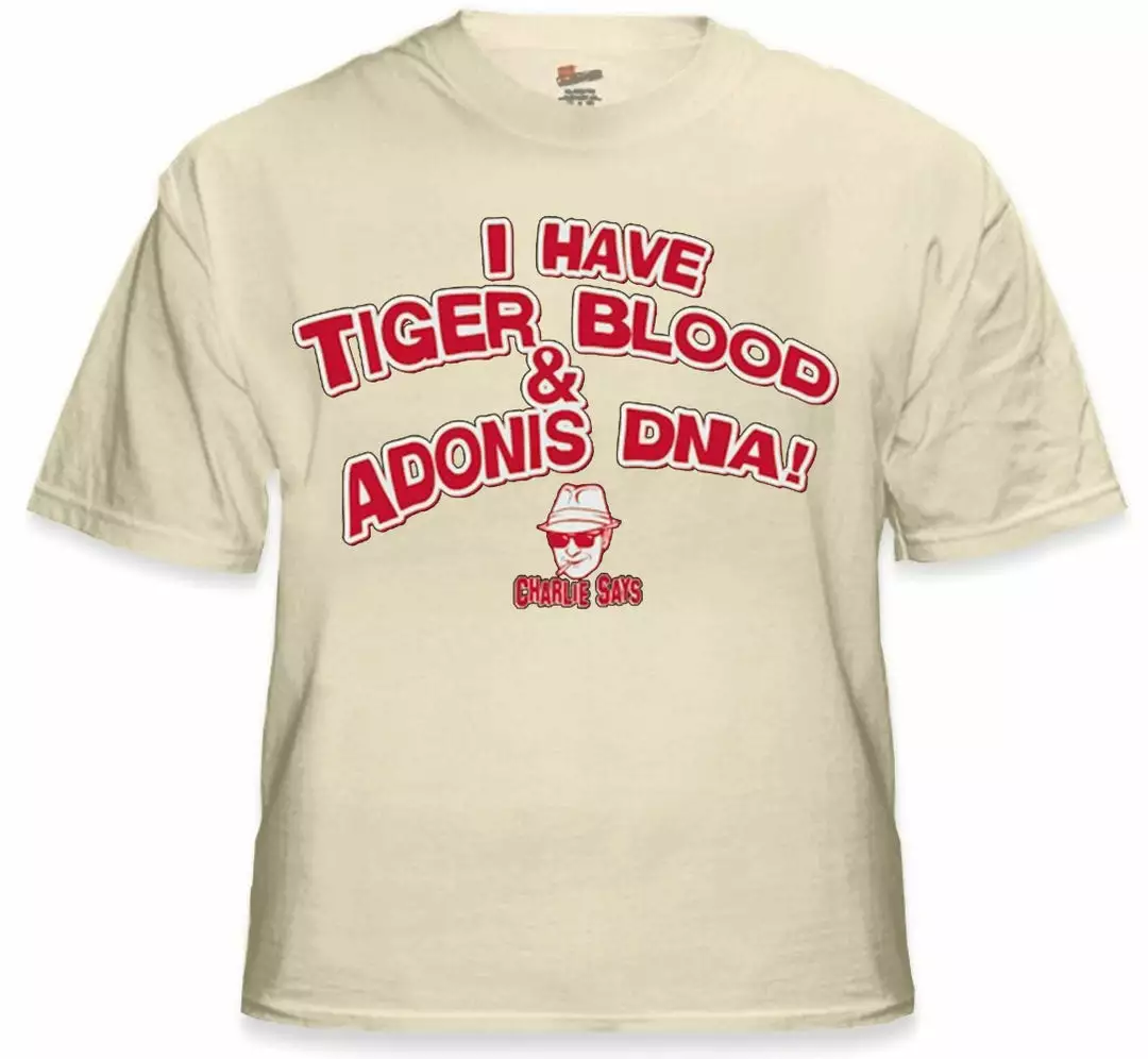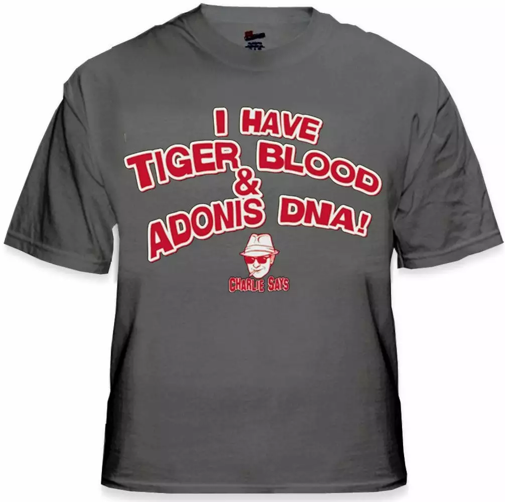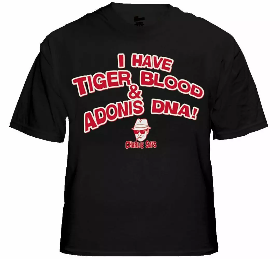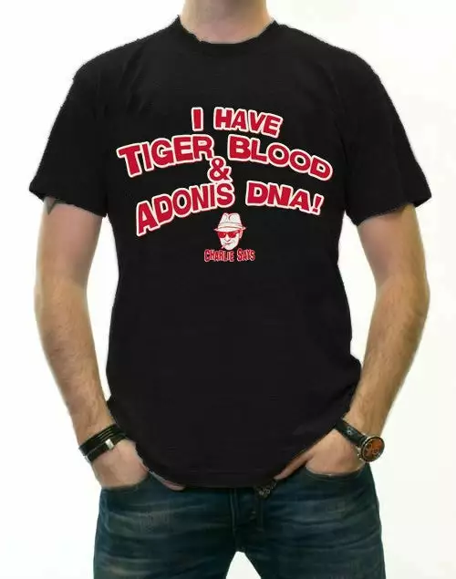 Charlie Says T-Shirts – I Have Tiger Blood ! T-Shirt. Since Charlie Sheen’s interview he has become more popular then ever, forget two and a half men. Charlie Sheen quote t-shirts have been in demand. Charlie Sheen has seemingly lost his mind and in celebration of the actor’s insanity we are proud to offer you this line of Cracked out shirts that feature some of Charlie’s most infamous sayings. These shirts will make you an instant party animal… if you can handle it. If you have Tiger Blood running threw your veins click the order button and expieriance Charlie Sheen Today! These shirts may feature popular Charlie Sheen quotes but are in no way affiliated with Charlie Sheen.