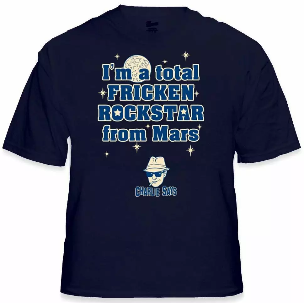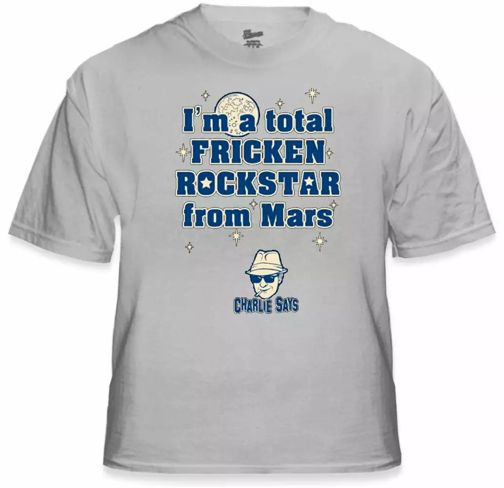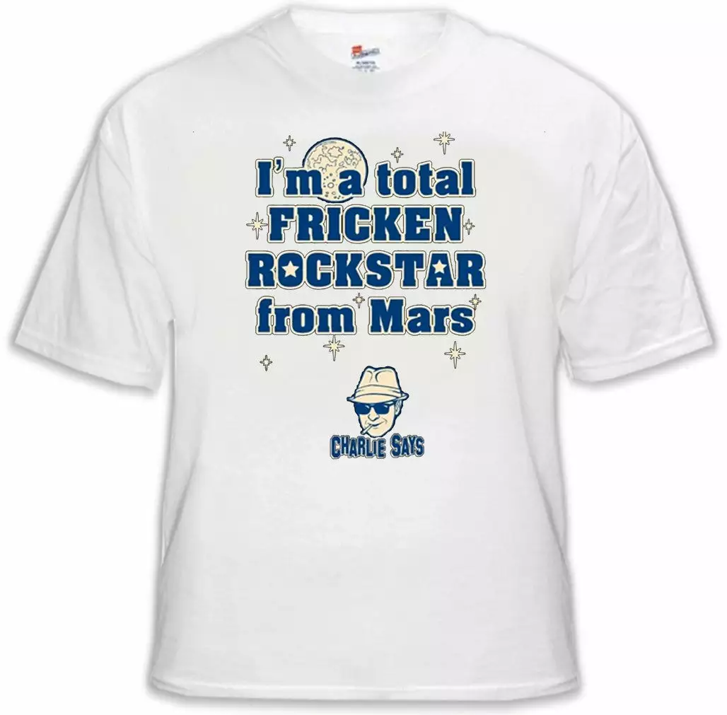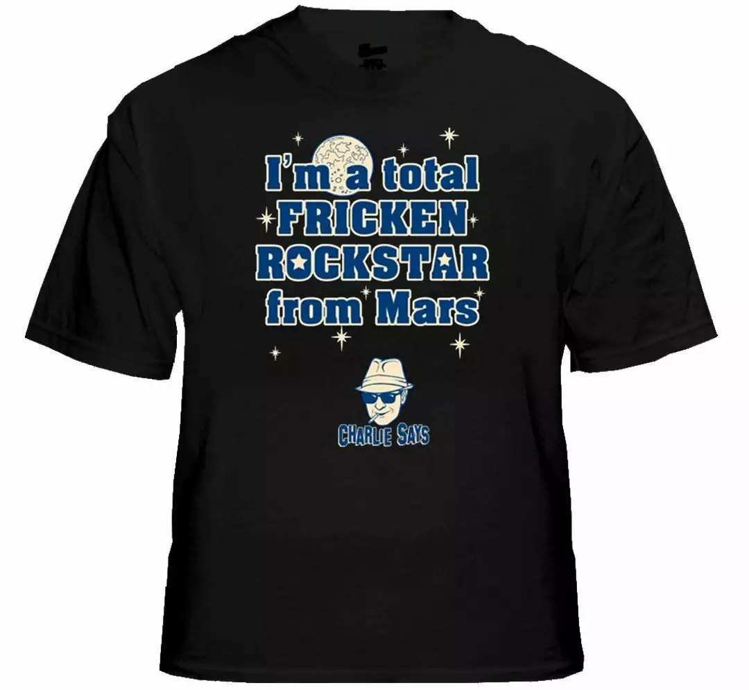 I’m a Total Frickin’ Rockstar From Mars T-Shirt. Since Charlie Sheen’s interview he has become more popular then ever, forget two and a half men. Charlie Sheen quote t-shirts have been in demand. Charlie Sheen has seemingly lost his mind and in celebration of the actor’s insanity we are proud to offer you this line of Cracked out shirts that feature some of Charlie’s most infamous sayings. These shirts will make you an instant party animal… if you can handle it. If you have Tiger Blood running threw your veins click the order button and expieriance Charlie Sheen Today! These shirts may feature popular Charlie Sheen quotes but are in no way affiliated with Charlie Sheen.