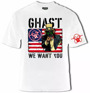 New from ghast is this Ghast Uncle Ghast Wants You T-Shirt white. All Ghast t shirts are made of 100% super soft cotton and completly machine washable. This white t-shirt has the Uncle Ghast Wants You design on the front of the shirt as well as the smaller ghast logo on the sleeve.