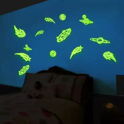 Our Deluxe glow in the dark galaxy set comes with 10 large pieces. You get all the shapes shown! With each pack you will receive 1 Galaxy, 2 Medium Moons, 1 Large Moon, 2 Medium Shooting Stars, 1 Large Shooting Star, 2 Different Planets and 1 Meteor. All of our fun galaxy shapes are made of super glow in the dark material that glows super bright in the dark for hours. These galaxy glow pieces will also glow brilliantly under black light. This set comes with double sided adhesive pads for easy mounting. Our glow in the dark galaxy pieces are perfect for decorating kids rooms, home theaters and can make a fun accent at your next glow party!