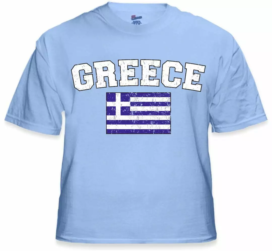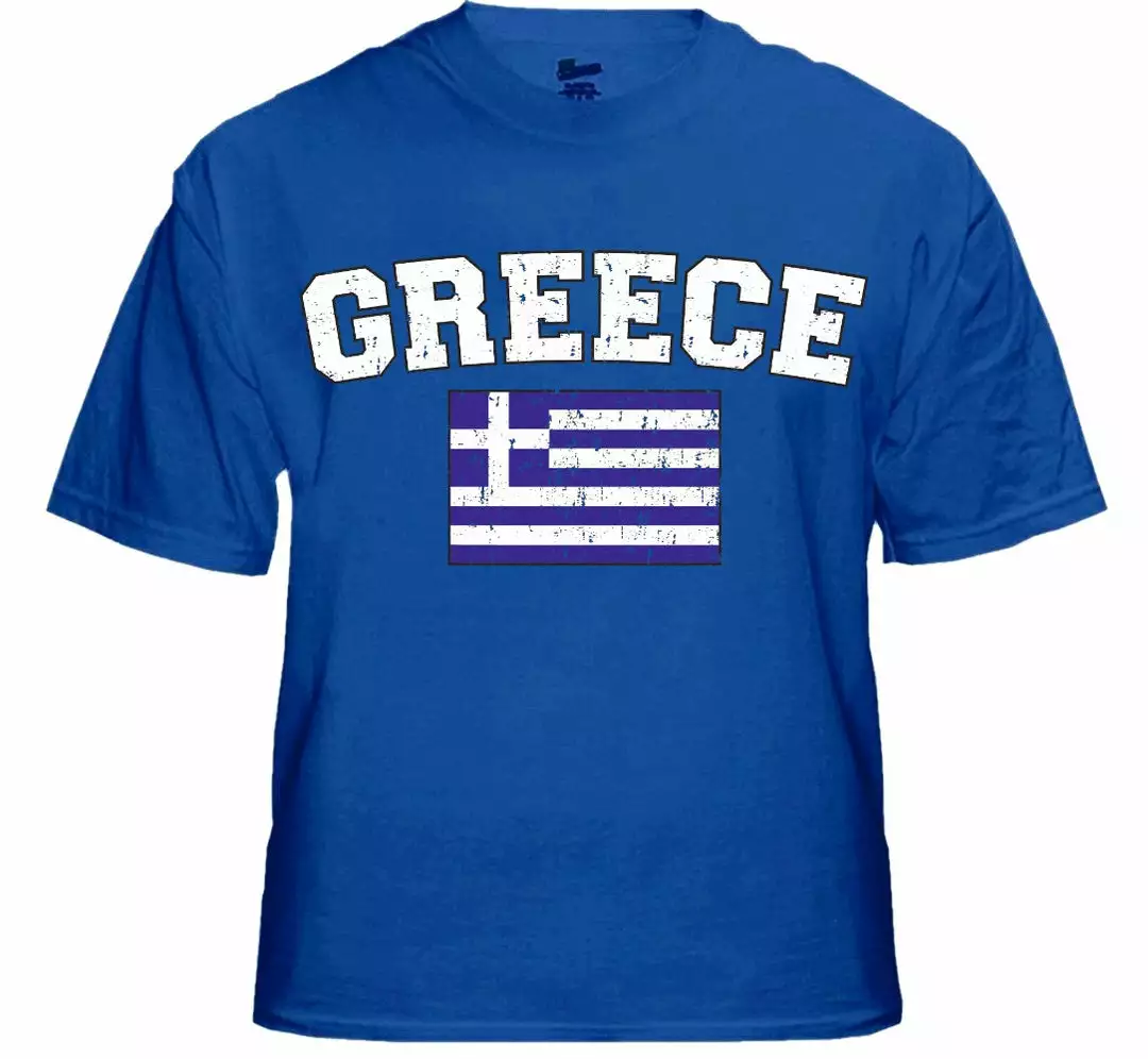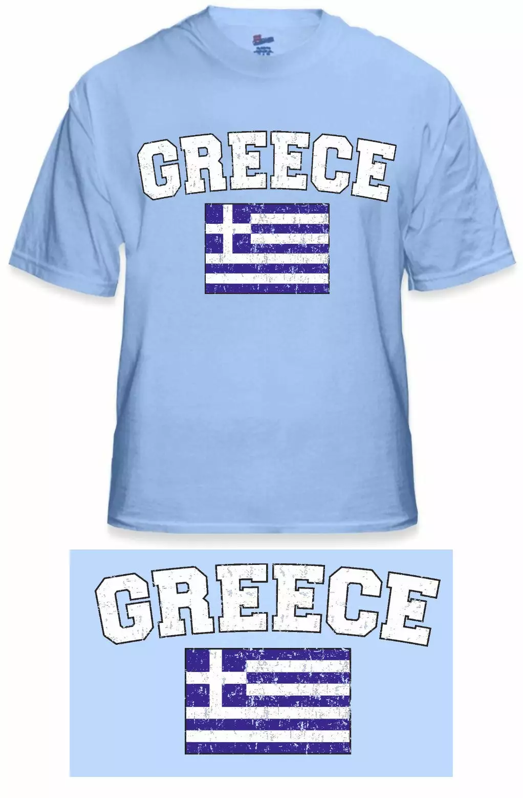 Greece Vintage Flag International Mens T-Shirt. Show pride for your favorite Nation! Our collection of deluxe vintage international print t-shirts are the perfect way to support your home country. Each shirt features premium vintage style designs made to look distressed for that soft “Favorite Old T-shirt” look from day one. These shirts are perfect whether you are rooting for your favorite soccer nation or just showing your love for a special country. Bold athletic style writing spells out each country’s name curved above the country’s national shield; a classic design that is sure to display your patriotism! Each shirt is printed to order on a deluxe Cotton tee shirt in your choice of color.