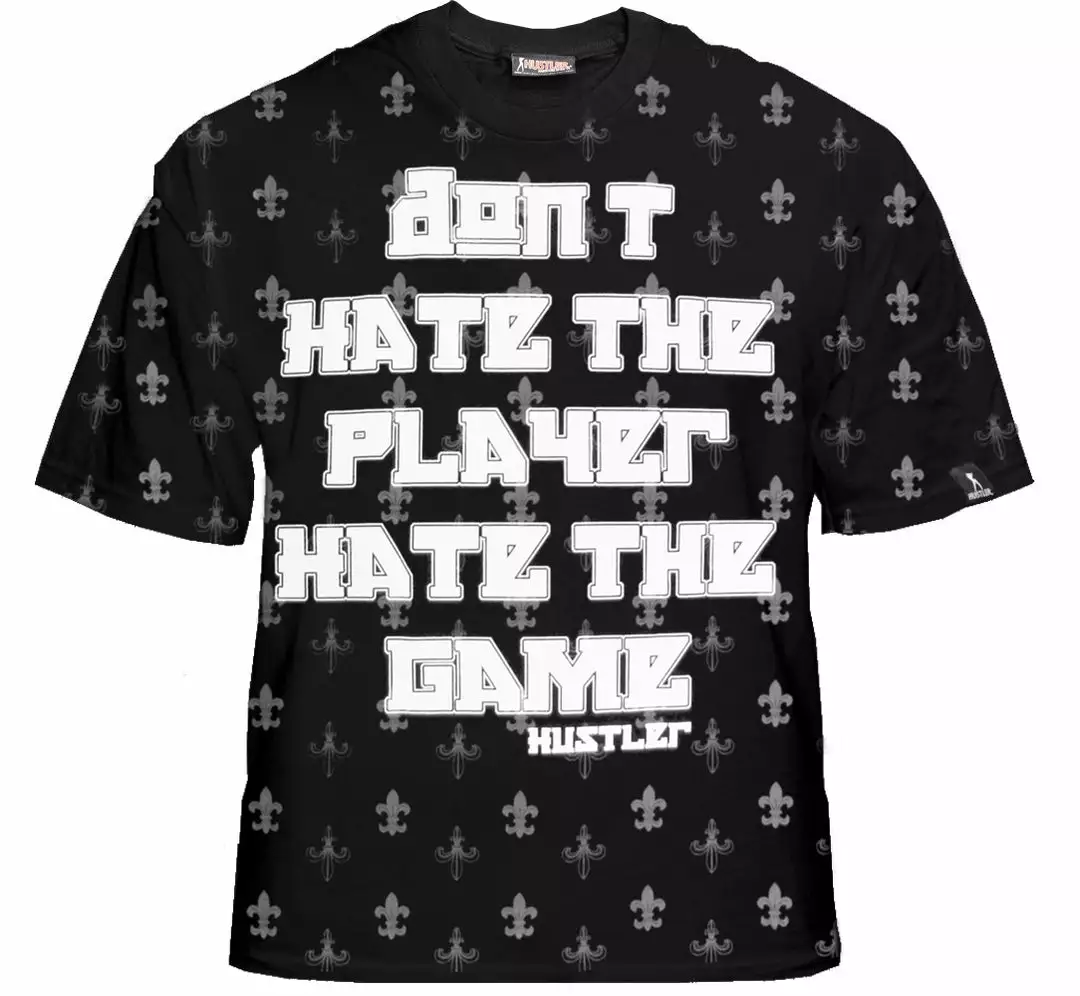 This black short sleeve Hustler “Hater” Men’s T-Shirt features the famous saying “Don’t hate the player, hate the game” With offcial hustler insignia bellow. The entire front of the shirt is then covered with fleur di lis paisley design that covers the whole front of shirt including the sleeves. Hustler kept it hardcore since 1974. Made in the USA of super soft machine washable cotton, Hustler Clothing will be your favorite attire for all occasions.