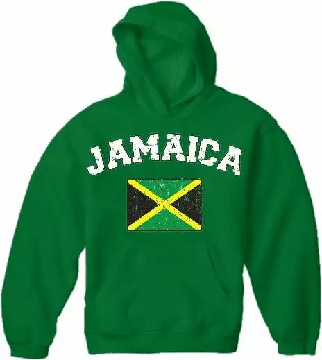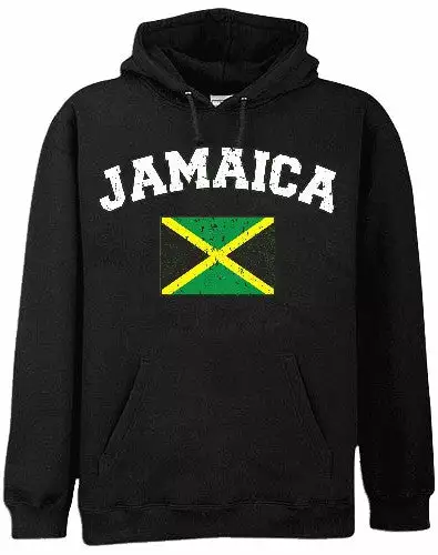 Jamaica Vintage Flag International Hoodie. Show pride for your favorite Nation! Our collection of deluxe vintage international print Hoodies are the perfect way to support your home country. Each shirt features premium vintage style designs made to look distressed for that soft “Favorite Old Sweatshirt” look from day one. These shirts are perfect whether you are rooting for your favorite soccer nation or just showing your love for a special country. Bold athletic style writing spells out each country’s name curved above the country’s national shield; a classic design that is sure to display your patriotism! Each shirt is printed to order on a deluxe hooded sweatshirt in your choice of color.