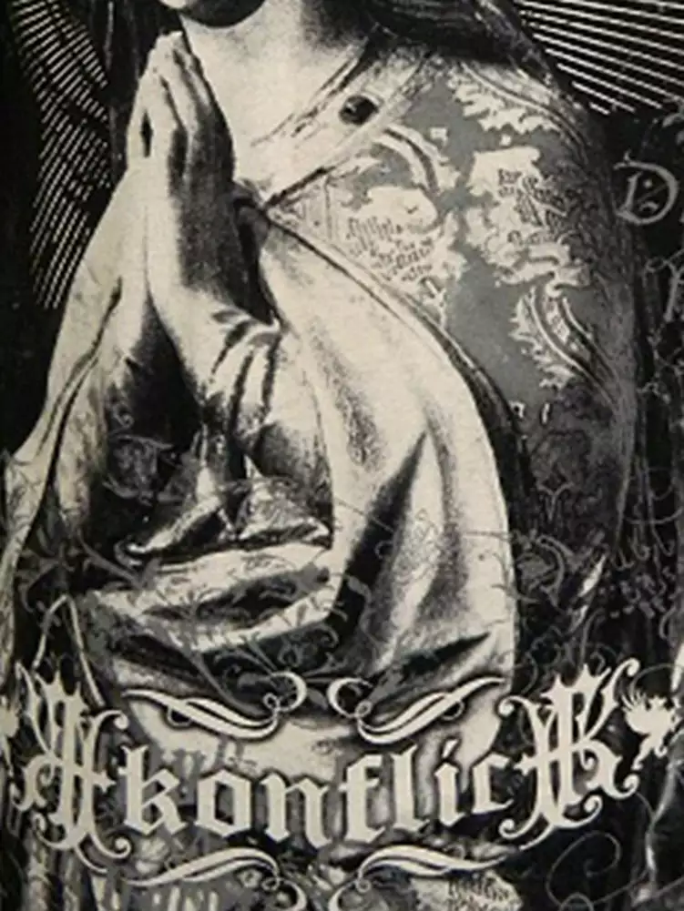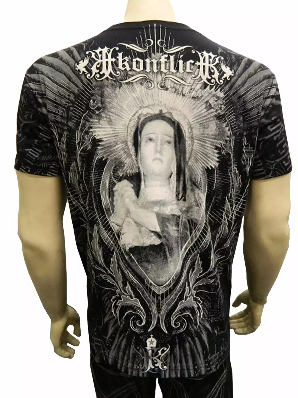 Konflic T2G “The Virgin Mary” T-Shirt. Enter the world of Konflict; a place where style rules and only the strong survive. Konflict T2G clothing brings you this full line of MMA inspired t-shirts the are perfect for an aggressive lifestyle. Each battle hardened t-shirt is sure to make look supreme whether you are sweatin’ it out at the gym, hittin’ the club or takin’ the streets by storm. Each Konflict T2G T-Shirt features premium 100% cotton construction, Detailed immersion ink prints all over and are accented by unique metallic ink for a bad ass look that’s all your own. Get with it and get in Konflict!