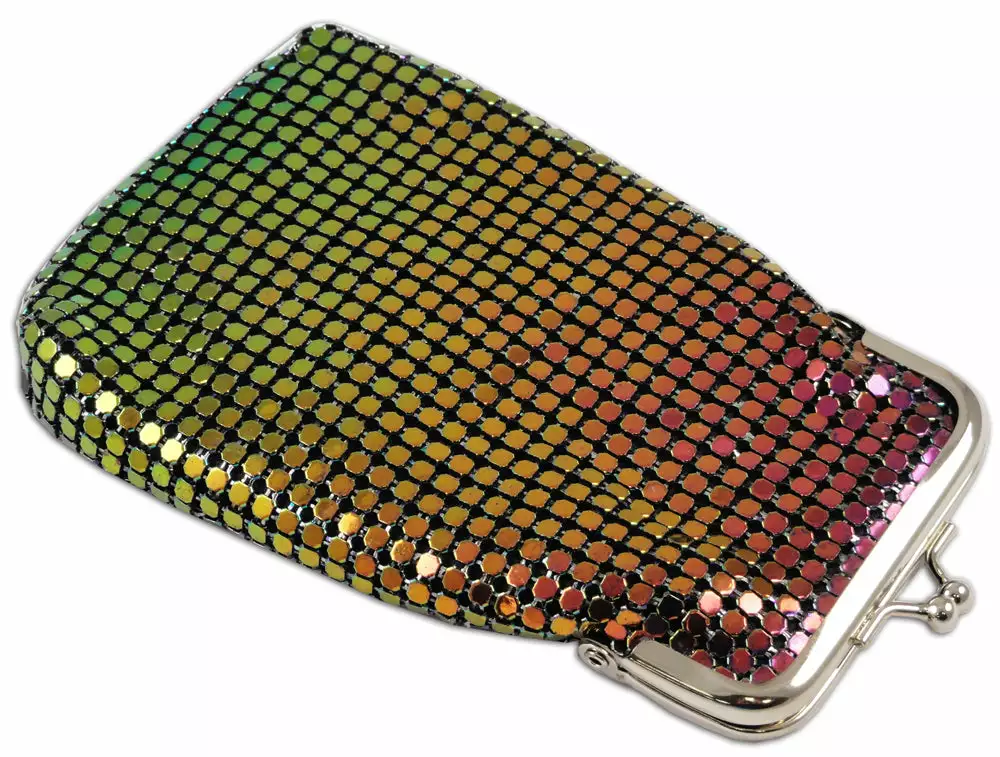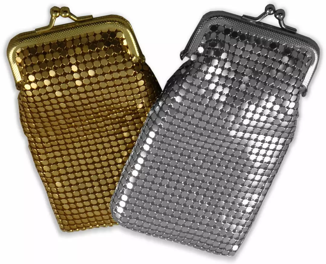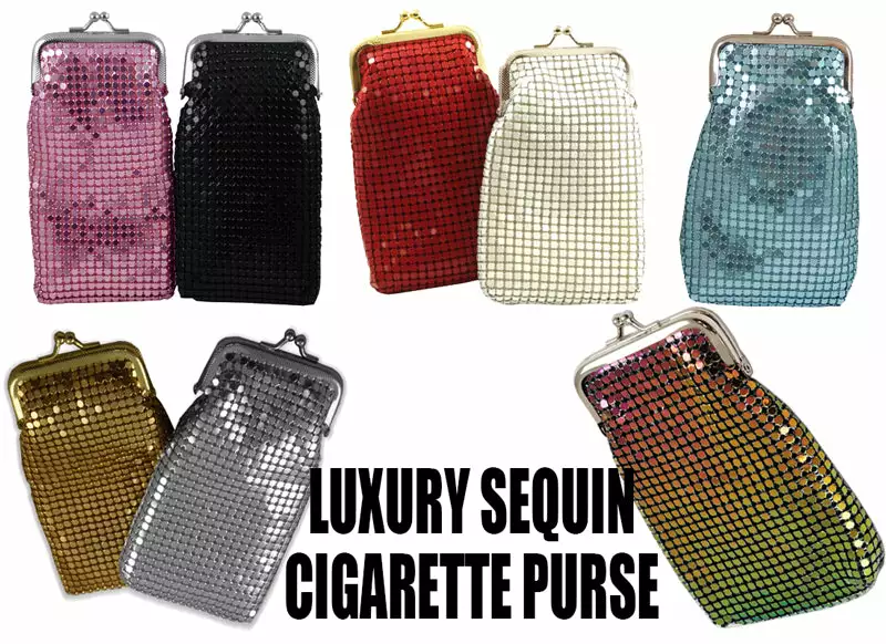 Each luxury sequin cigarette purse is meticulously hand crafted with thousands of interlinked polished metal sequins atop a sleek padded silk material that accentuates the shine of each and every sequin. This cigarette purse will hold a full pack of any size cigarette from king sized to 100’s. Twin Ball Clasps keep the pouch sealed and closed until you are ready to open it up and use it keeping your cigarettes protected in style. With your order you will recieve 1 of these fine cases in your choice of metallic color.