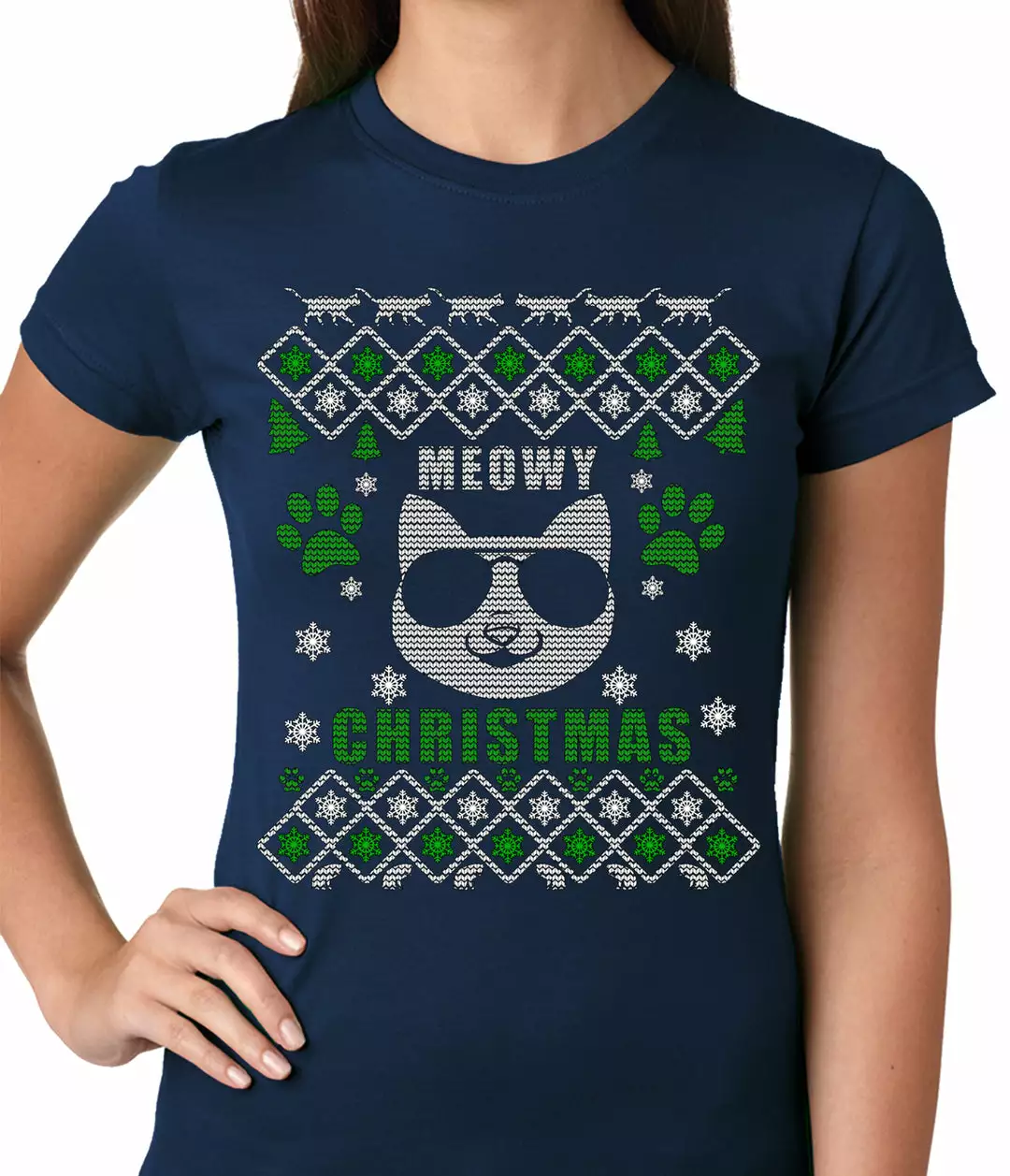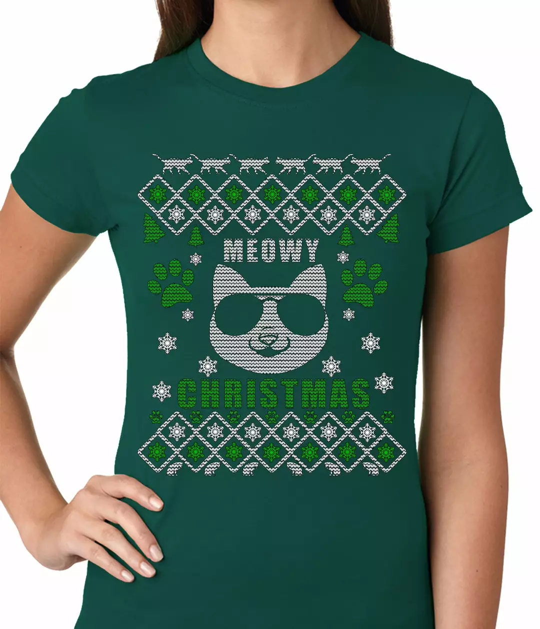 Bewild Meowy Christmas – “Cool Cat With Glasses” Ugly Christmas Ladies T-shirt