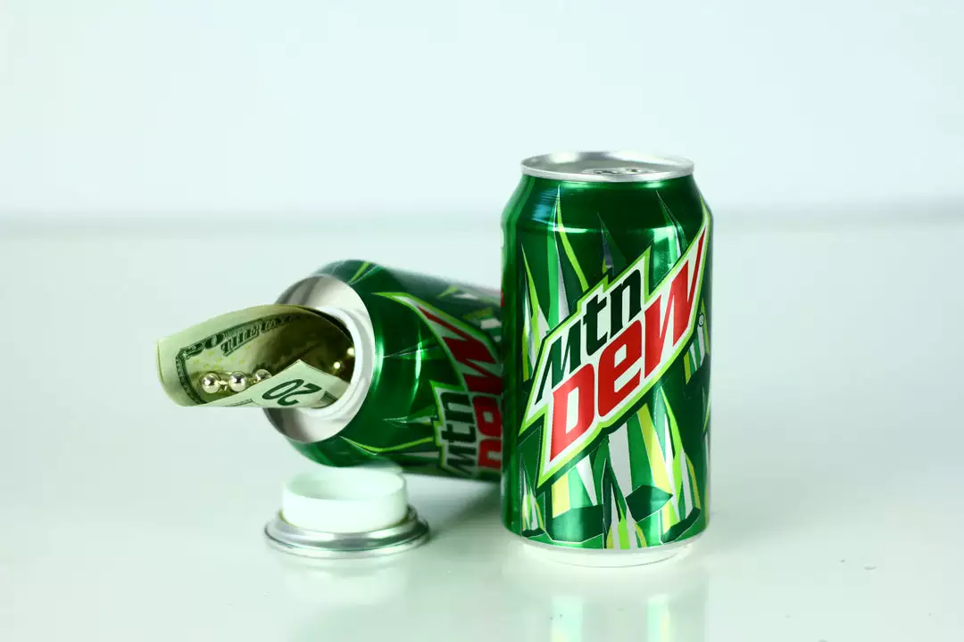 Mtn Dew Diversion Can Safe. With our Diversion safe cans you can protect your valuables and keep them in plain sight with out fearing theft or detection. Can safes work on a very simple concept, hide your possessions where nobody would think to look. Each Diversion safe is made of an authentic brand name container so the safe appears to be just that normal product. The can safes are then filled and weighed to feel full and un opened. Nobody would ever suspect your un-opened can of soda is actually holding your most prized possessions. Where dose a wise man hide a pebble? On the beach.. This is the same concept, Fill each stash can with what ever you like; money, jewelry or even Rx Drugs. You can then seal the safe and place it with other soda cans in a six pack, in the fridge and other obvious places. The average burglar spends no more then 10 mins in a victims home giving thieves no time to tare up your pantries. They would rather take your plasma TV then your can of soda, and they would rather tare threw drawers and jewelry boxes then steal all the food in your kitchen. This puts the odds in your favor. Each can can hold thousands of dollars and an amazing amount of jewelry or Rx drugs so you can keep it all safe in a diversion safe can.