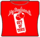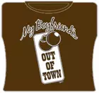 My Boyfriend Is Out Of Town Girls T-Shirt. Exclusively from Bewild.com, these new tee’s feature hard-core sayings that say it all. From “Lick Here For Full View” to “Skanky white-trailer trash”. How about a t-shirt that says “Dip me in Chocolate and throw me to the lesbians?” Our short sleeve “My Boyfriend Is Out Of Town” t-shirts are made from a 100% fully machine washable preshrunk cotton for a cool and comfortable fit every time.