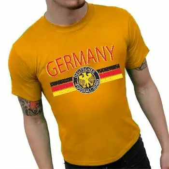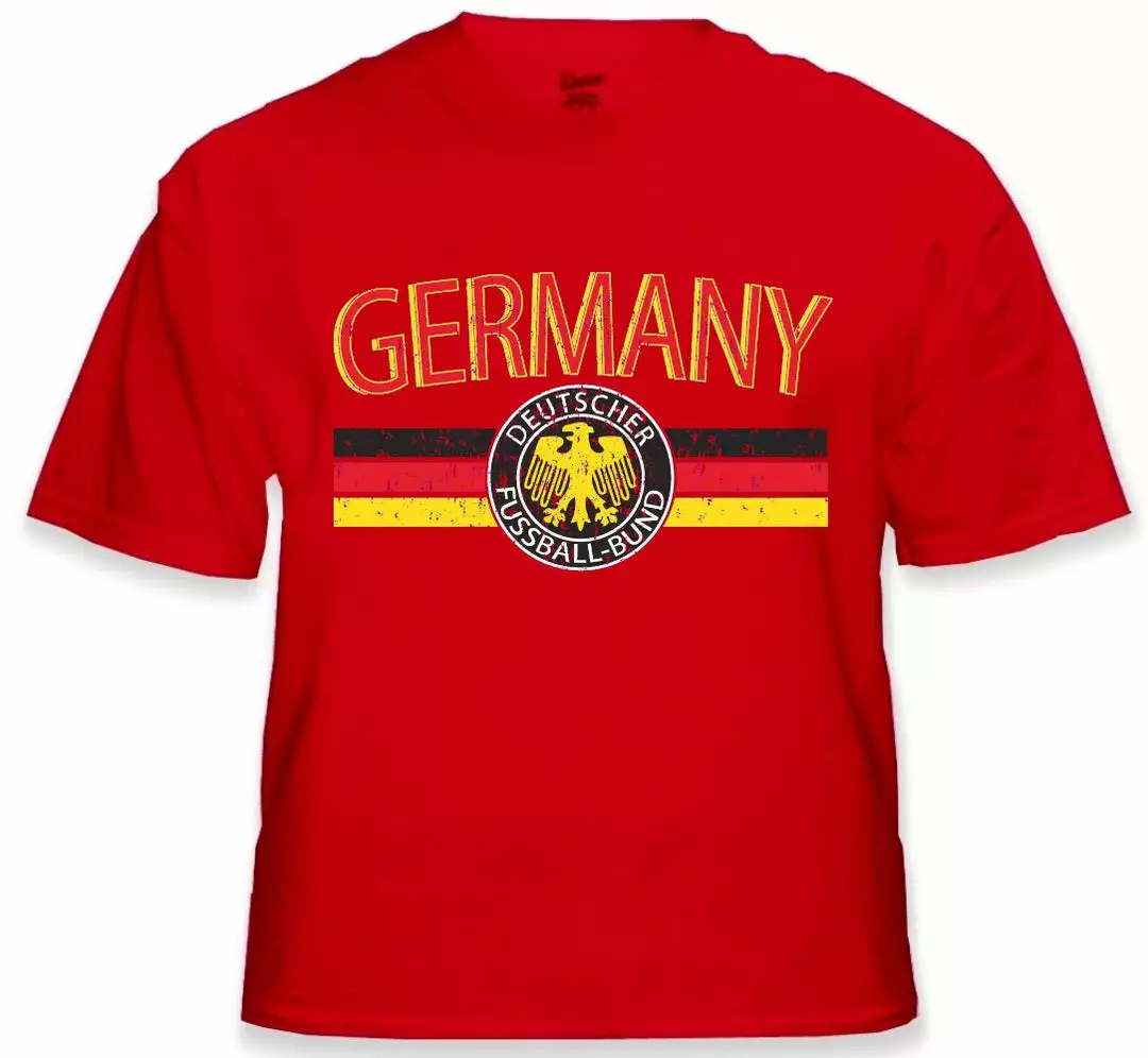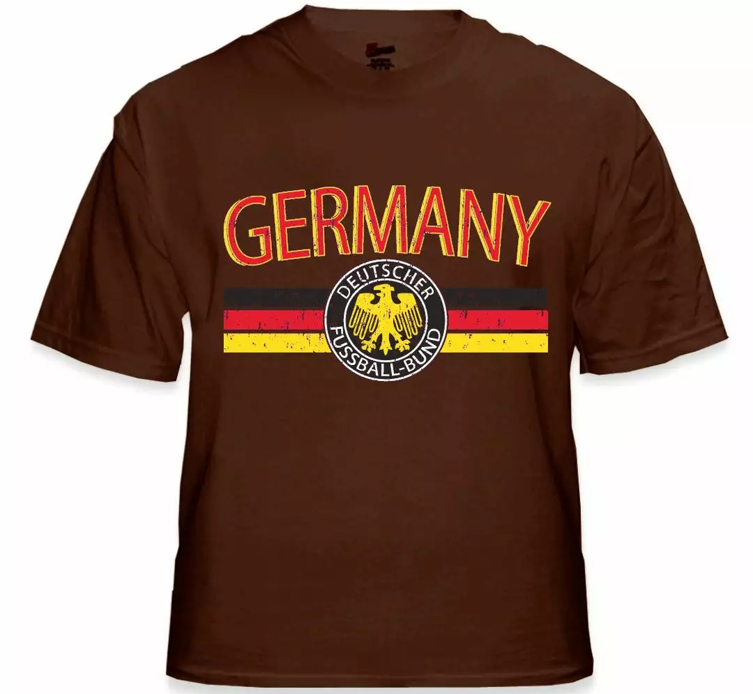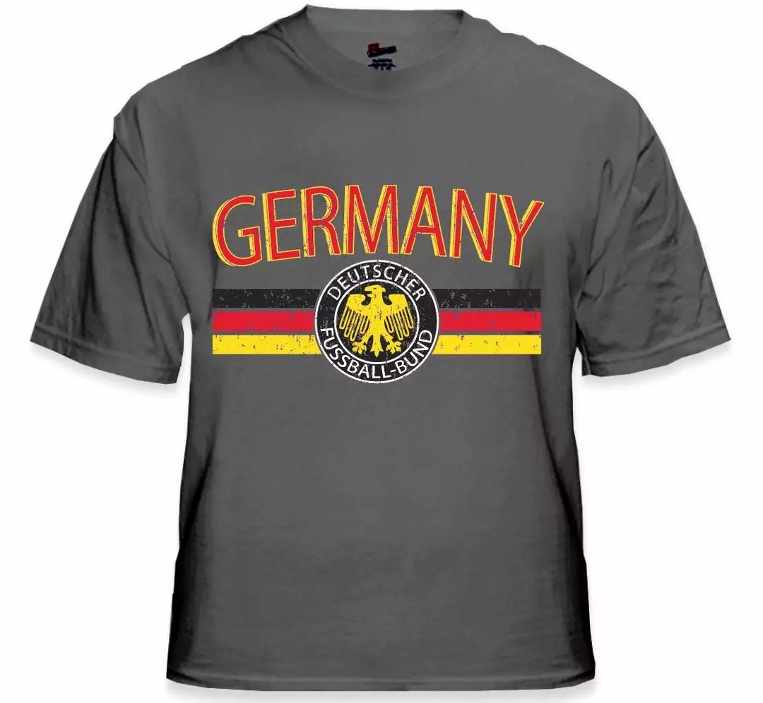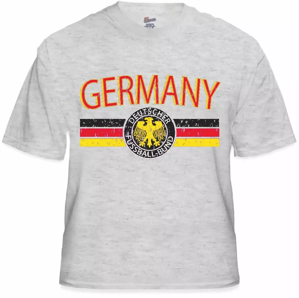 Germany Vintage Shield International Mens T-Shirt. Show pride for your favorite Nation! Our collection of deluxe vintage international print t-shirts are the perfect way to support your home country. Each shirt features premium vintage style designs made to look distressed for that soft “Favorite Old T-shirt” look from day one. These shirts are perfect whether you are rooting for your favorite soccer nation or just showing your love for a special country. Bold athletic style writing spells out each country’s name curved above the country’s national shield; a classic design that is sure to display your patriotism! Each shirt is printed to order on a deluxe Cotton tee shirt in your choice of color.