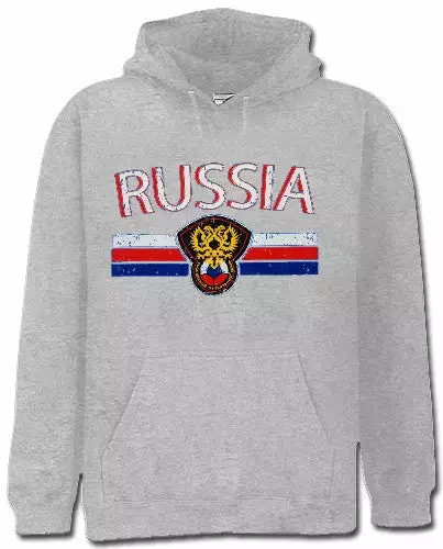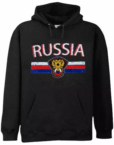 Russia Vintage Shield International Hoodie. Show pride for your favorite Nation! Our collection of deluxe vintage international print Hoodies are the perfect way to support your home country. Each shirt features premium vintage style designs made to look distressed for that soft “Favorite Old Sweatshirt” look from day one. These shirts are perfect whether you are rooting for your favorite soccer nation or just showing your love for a special country. Bold athletic style writing spells out each country’s name curved above the country’s national shield; a classic design that is sure to display your patriotism! Each shirt is printed to order on a deluxe hooded sweatshirt in your choice of color.