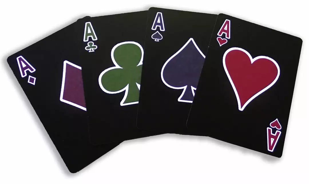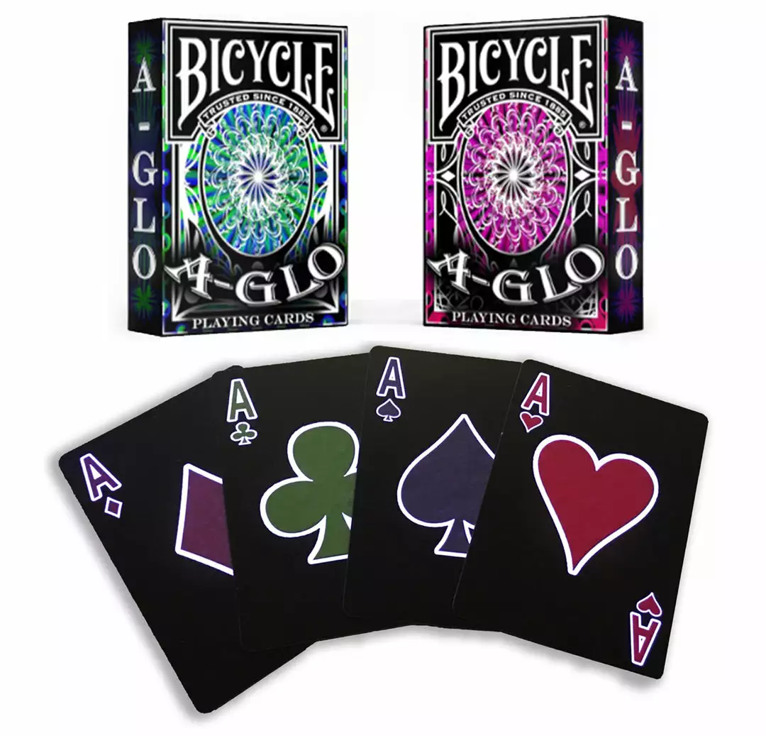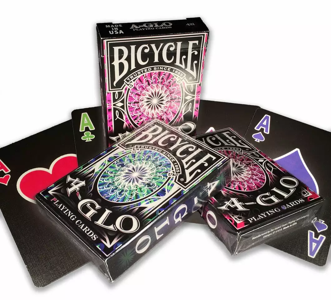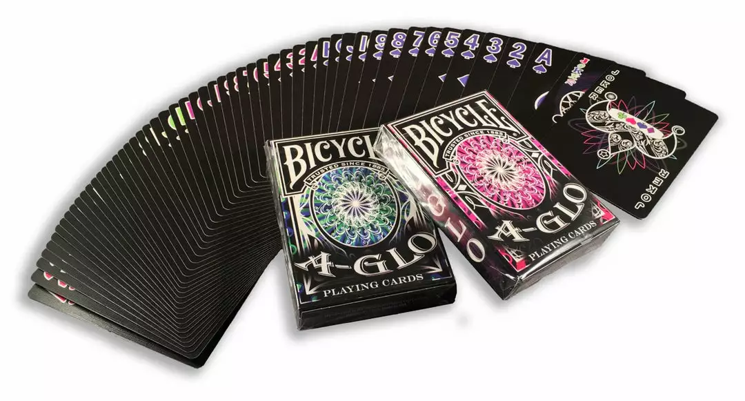 A-Glo Playing Cards are essentially the cards that fill in all the gaps. With easy to identify court cards, unique but uniform pip arrangements, large font, a colorful attitude and Ultraviolet Ink these unique cards are great for so many situations. From adult parties to kid’s games, from people with special interest (Cardistry and Magicians) to people with special needs (ADHD) these exciting and engaging playing cards are great for a plethora of different situations… Just not a High Stakes Texas Hold’em game. Made with ultra violet ink that glows under black light.