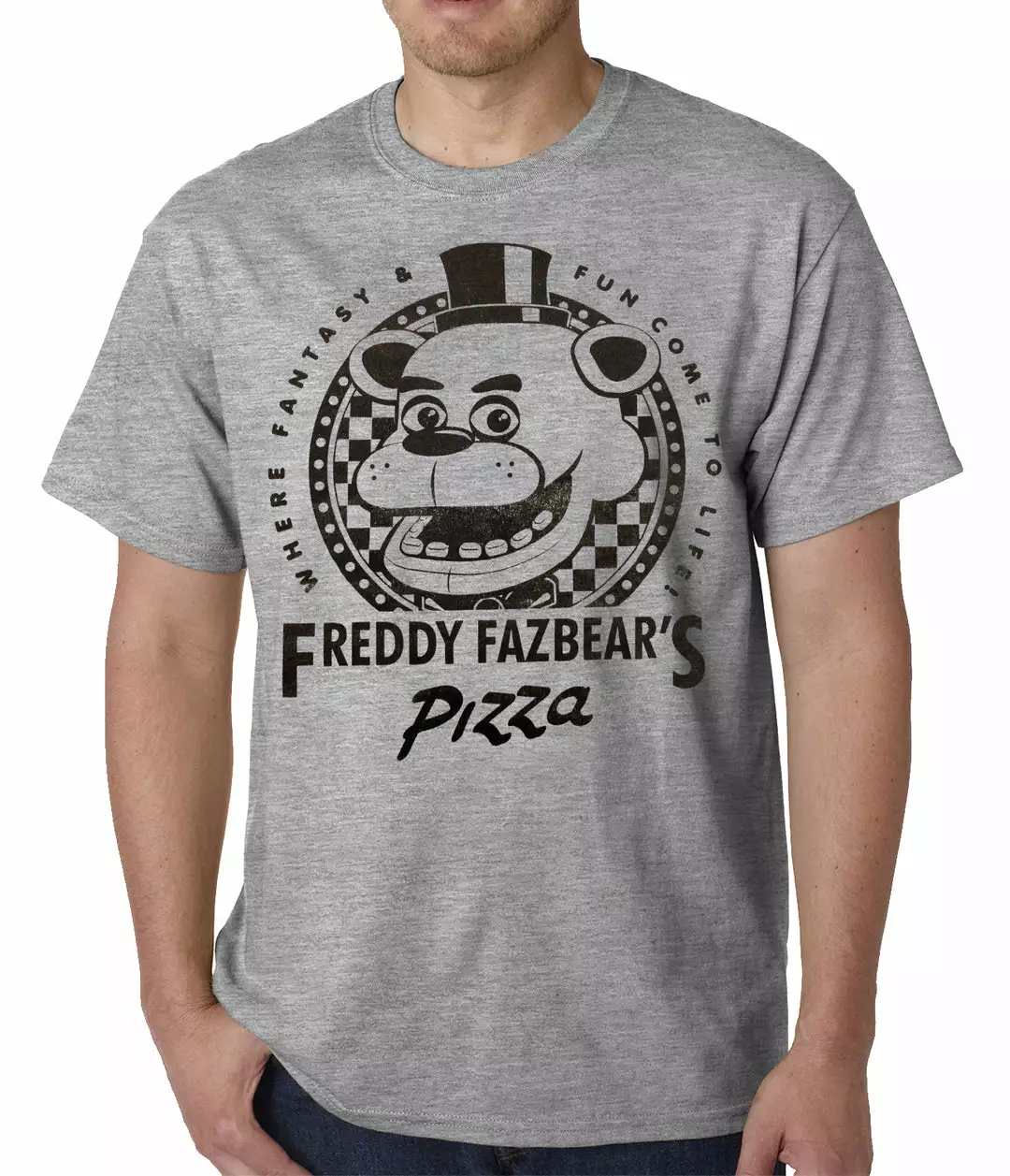 Get your hands on this amazing Official Five Nights at Freddy’s Fazbears Pizza Mens T-Shirt (Heather Grey) Men’s T-shirt. All of our Official Five Nights at Freddy’s Fazbears Pizza Mens T-Shirt (Heather Grey) Men’s T-shirts have a classic, comfortable fit as well as being pre-shrunk, so you can expect little to no shrinkage.