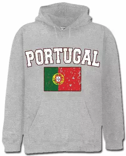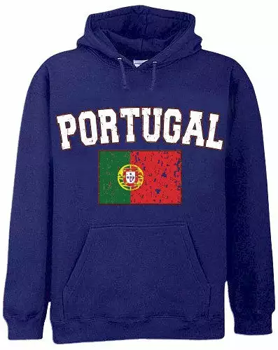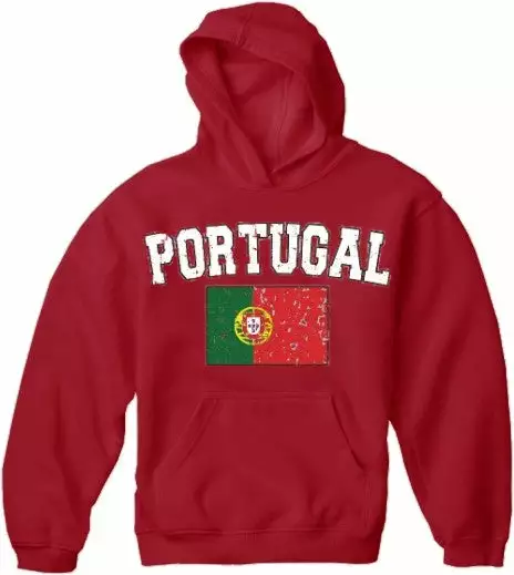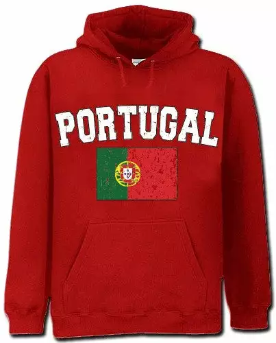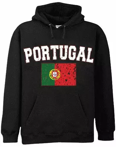 Portugal Vintage Flag International Hoodie. Show pride for your favorite Nation! Our collection of deluxe vintage international print Hoodies are the perfect way to support your home country. Each shirt features premium vintage style designs made to look distressed for that soft “Favorite Old Sweatshirt” look from day one. These shirts are perfect whether you are rooting for your favorite soccer nation or just showing your love for a special country. Bold athletic style writing spells out each country’s name curved above the country’s national shield; a classic design that is sure to display your patriotism! Each shirt is printed to order on a deluxe hooded sweatshirt in your choice of color.