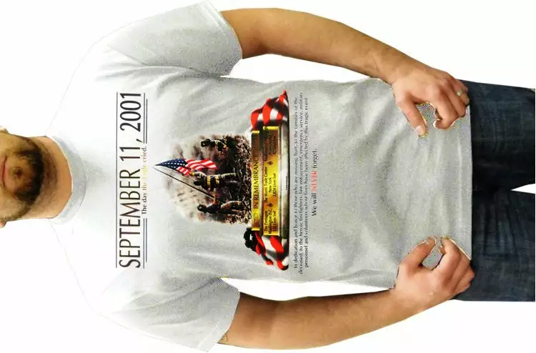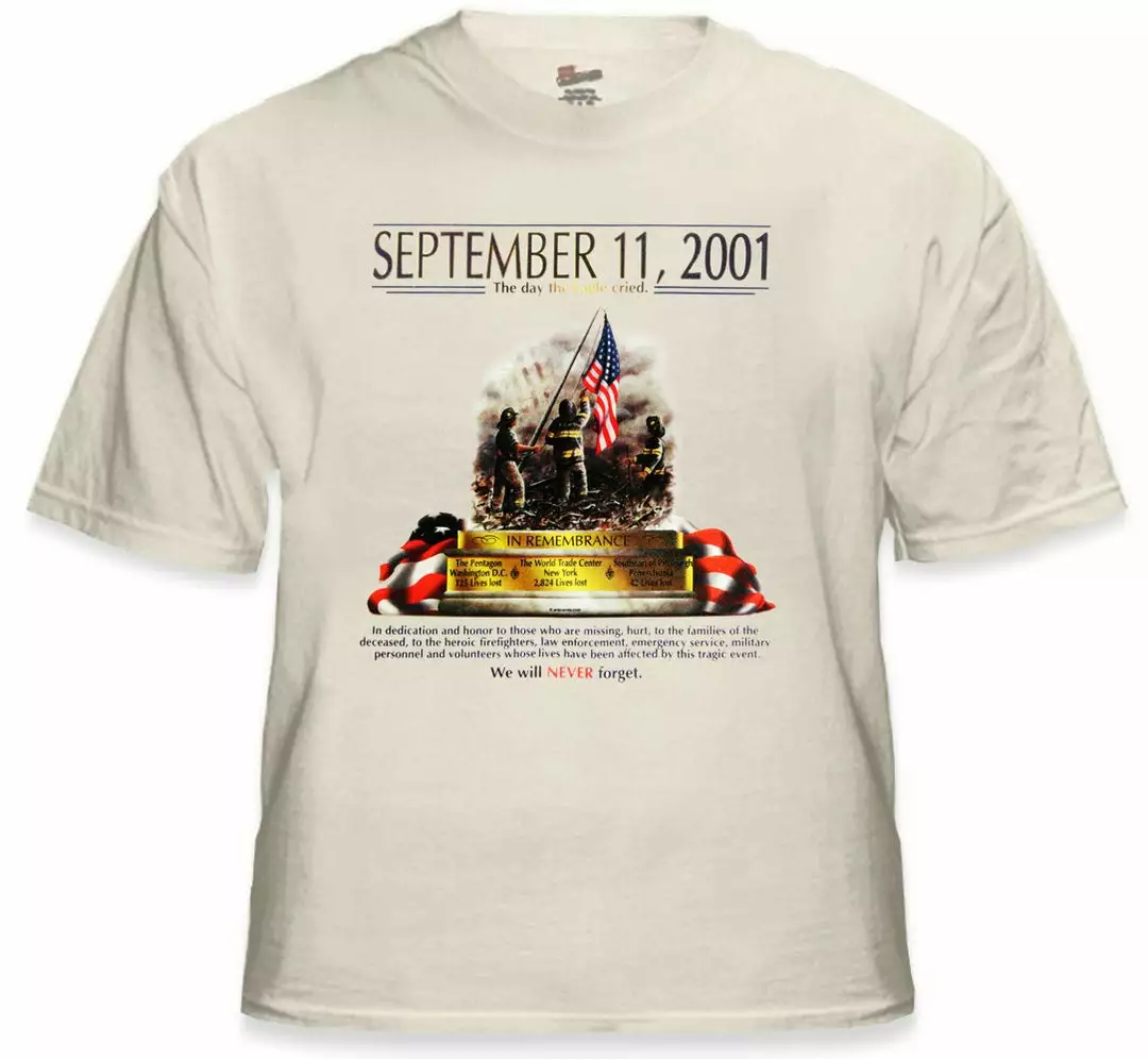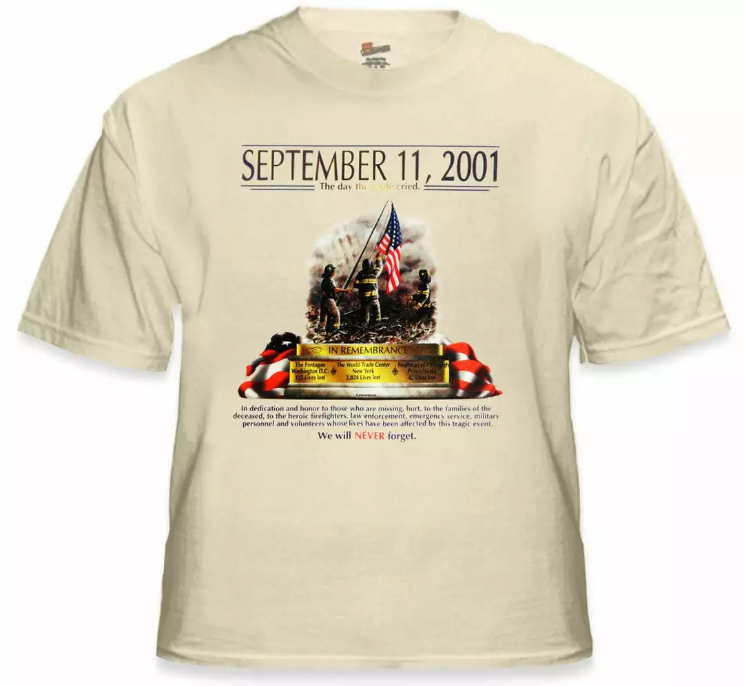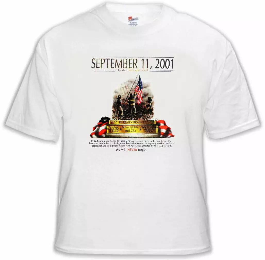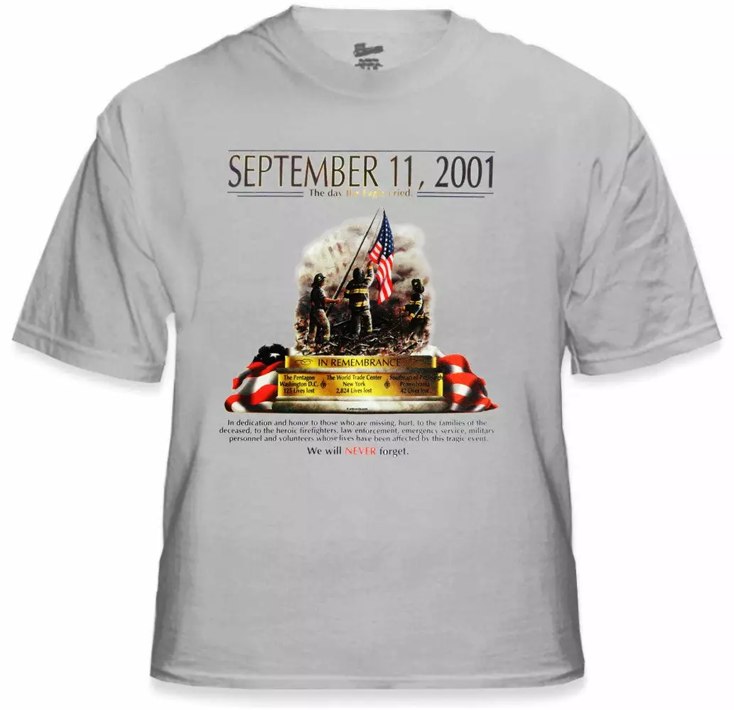 9/11 Never Forget Memorial T-Shirt. This WTC 9-11 memorial t-shirt displays with honor the remembrance of 10th anniversary of the most tragic event in US history. Ten years after 9-11 all Americans are still united as 1 and we will never forget. This t-shirt is the perfect way to show your support to commemorate the tragedy of that sunny day in September.