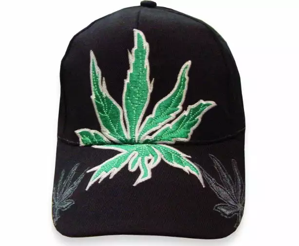 Pot Leaf Baseball Hat. Our brand of high quality work hats make you look like the pro you are. Tough heavy embroidery looks great and will take a beating even after a hard days work. All of our quality thick woven hats are 100% acrylic, cotton embroidered and features a Marijuana tag on the back above the Velcro adjuster. This hat is one size fits all adjustable for a perfect fit.