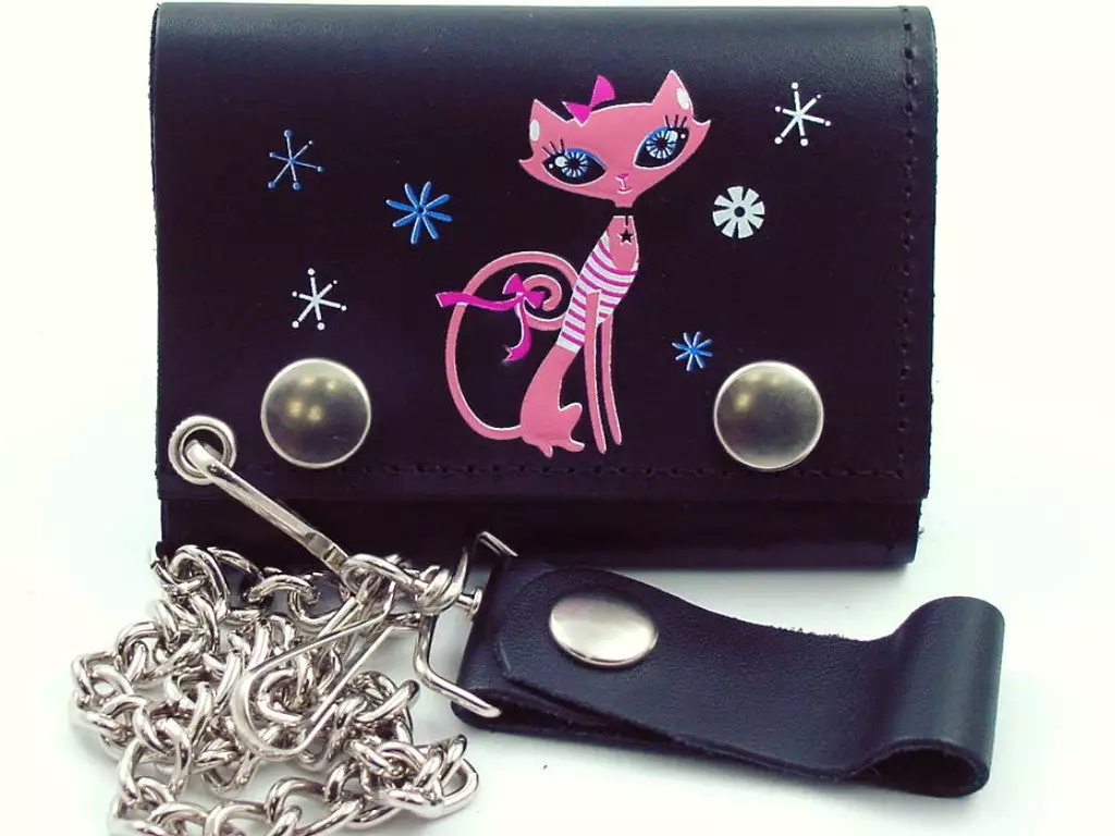 Pretty Pink Kitty Genuine Leather Chain Wallet.Our Genuine Leather Chain Wallets Are made with you in mind, with all the compartments you need for all your valuables, money, credit cards ID cards and photos all in one great looking secure place. Made of 100% real leather these wallets are beefy and tough and of course look great! This Wallet comes complete with a removable 17” chrome chain that easily clips to a sturdy corner rivet on the wallet. To attach this chain wallet to you pants simply snap the leather button hoop to the front belt loop of your pants. This wallet is a great fashion statement but also secures your wallet and belongings safely to you making theft or loss of your wallet nearly impossible. the chain also features a loose clip that is perfect for attaching your keys keeping them safe and secure as well. The wallet itself features 4 separate compartments including 2 for your credit cards and IDs, one for pictures that holds 12 wallet sized photos and one over sized money compartment on the top that is big enough to hold any kind of international currency.