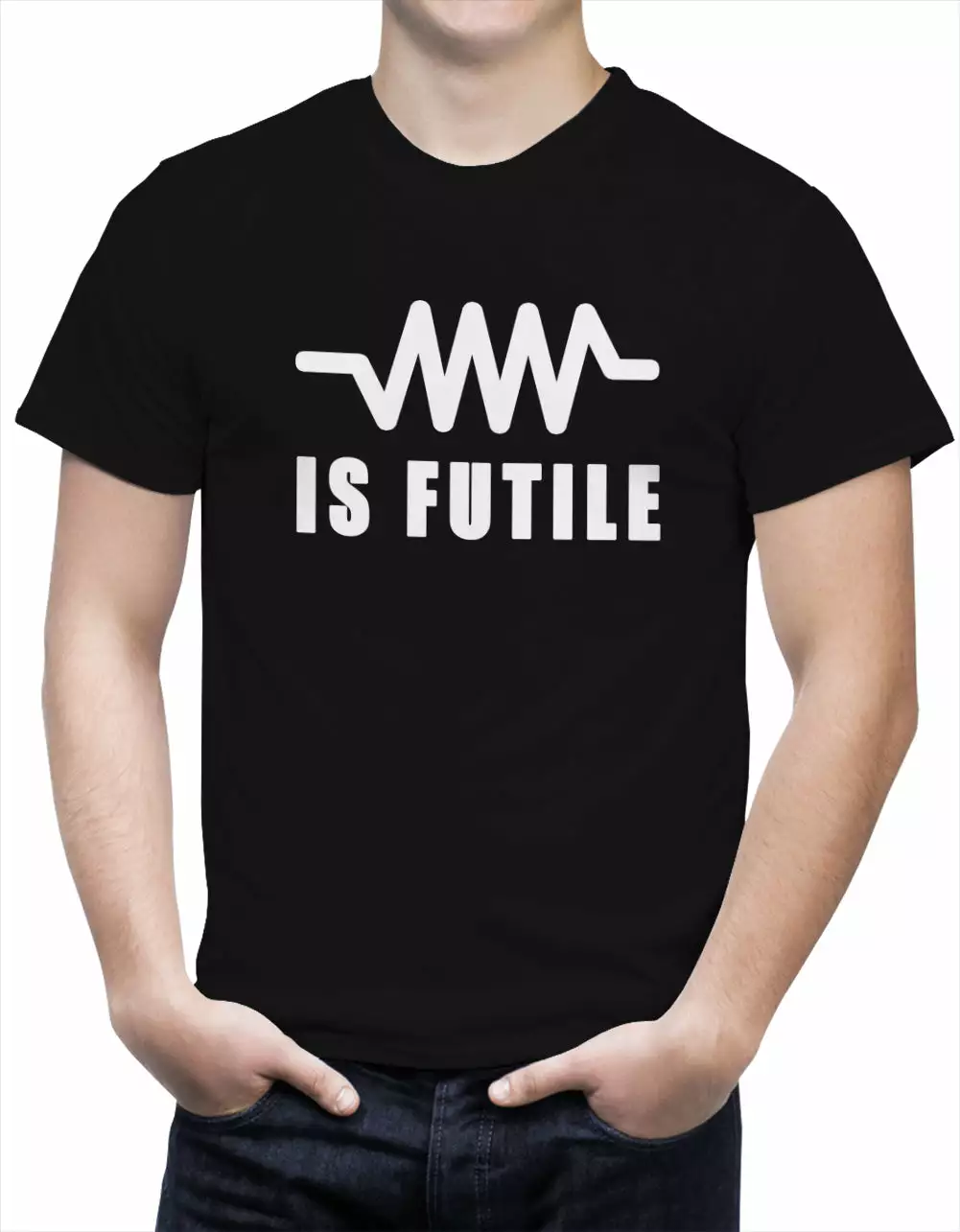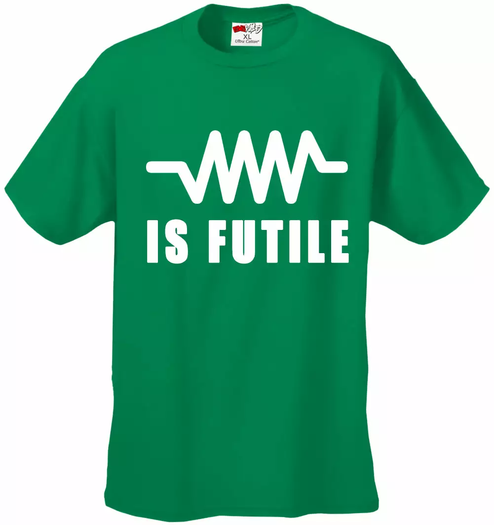 Whether you’re a math wiz or just a casual fan of Star Trek: the Next Generation, this shirt is for you! As well all learned in High School, Resistance Is Futile (at less than 1 OHM, of course). And the Borg on TNG were huge fans of letting everyone know just how futile it was. Capt. Picard of the Starship Enterprise was no stranger to this mathematical equaition either.