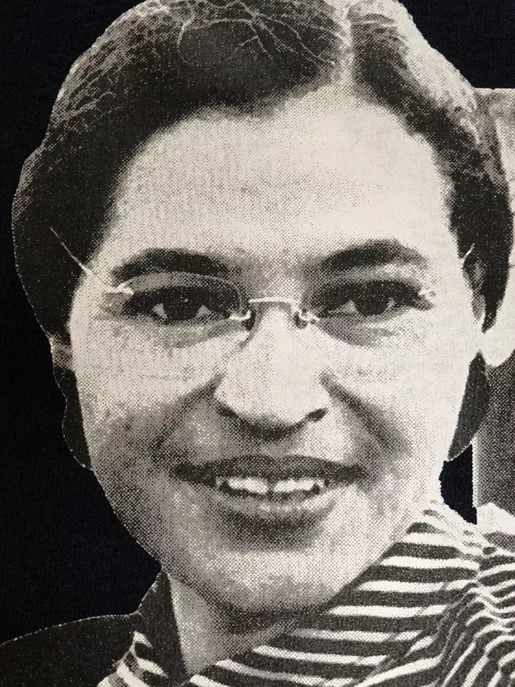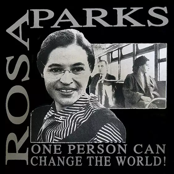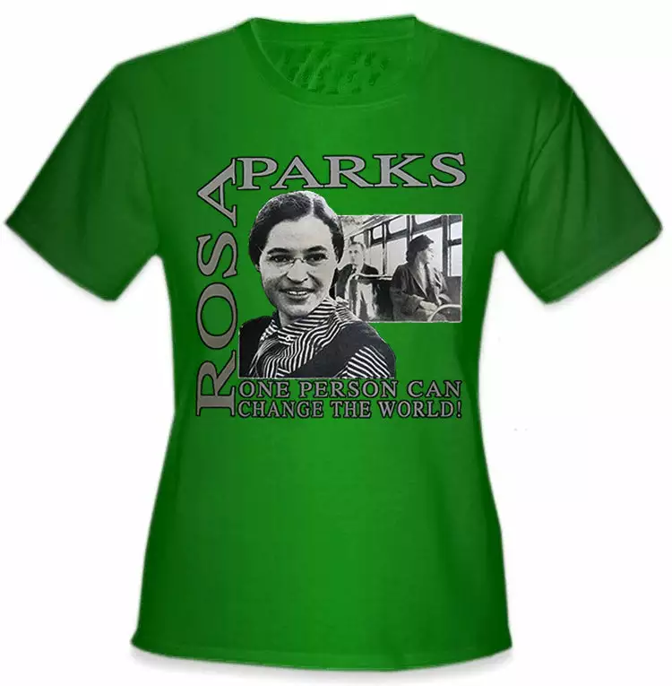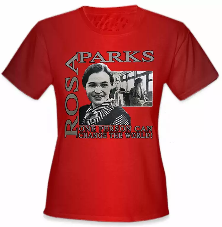 Rosa Parks “Change The World” Girl’s T-Shirt. This powerful commemorative t-shirt remembers the actions of Rosa Parks who sat so all african Americans could stand and be equal. This shirt has a photographic image of Rosa Parks and also has a representation of Rosa sitting on the bus (in front of a white man) on the day that forever changes history.