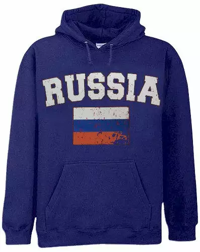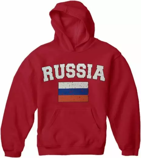 Russia Vintage Flag International Hoodie. Show pride for your favorite Nation! Our collection of deluxe vintage international print Hoodies are the perfect way to support your home country. Each shirt features premium vintage style designs made to look distressed for that soft “Favorite Old Sweatshirt” look from day one. These shirts are perfect whether you are rooting for your favorite soccer nation or just showing your love for a special country. Bold athletic style writing spells out each country’s name curved above the country’s national shield; a classic design that is sure to display your patriotism! Each shirt is printed to order on a deluxe hooded sweatshirt in your choice of color.